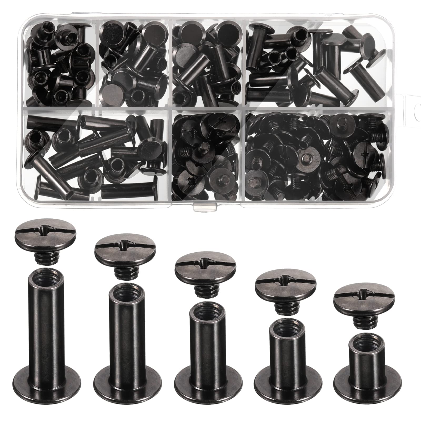 In a storage box: The carbon steel chicago screws kit is packed by a clear storage box, which is partition put according to their sizes, easy to get your wanted size and convenient to carry. Good material: Made of quality carbon steel material, nickel plated, sturdy and anti-rust, easy to bind, install and remove, can use repeatedly, good tightness. Wide application: Delicate and has good decoration effect, especially suit for leather handicrafts decoration, bookbinding, document, book, album, DIY crafts and etc. Specification: Color: as picture shown Size: (Each set of screw includes 2 parts, a post and a cross head stud) Quantity: 80 sets in total Package include: 80 Sets chicago screws 1 x Clear storage box Warm note: small parts, please keep away from child.