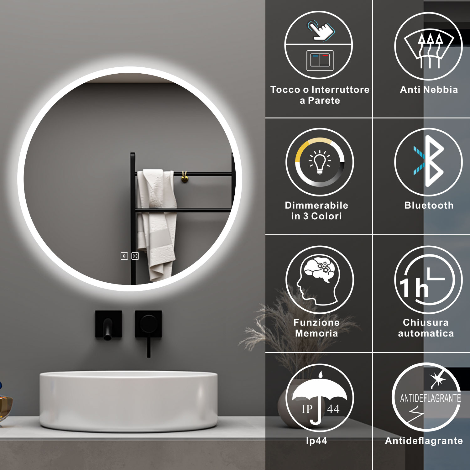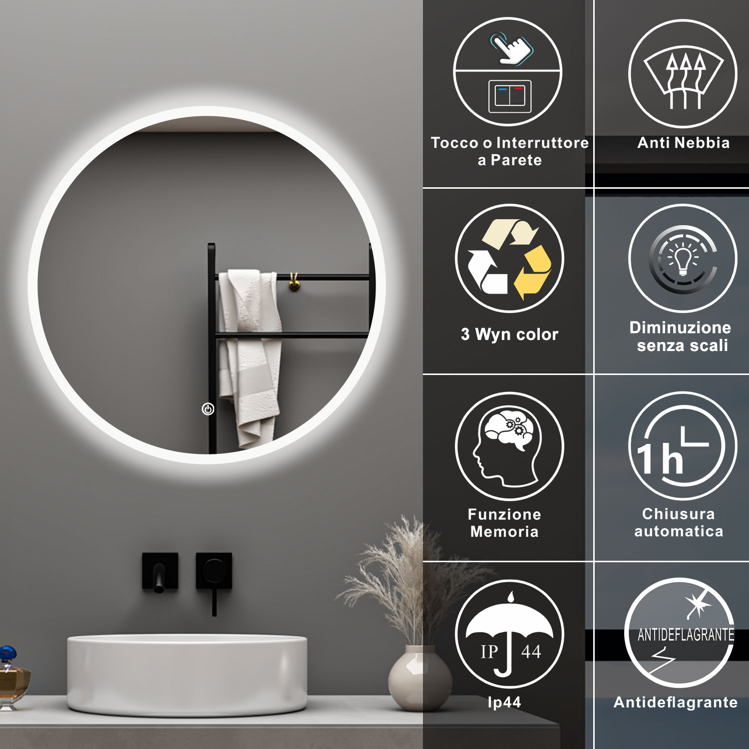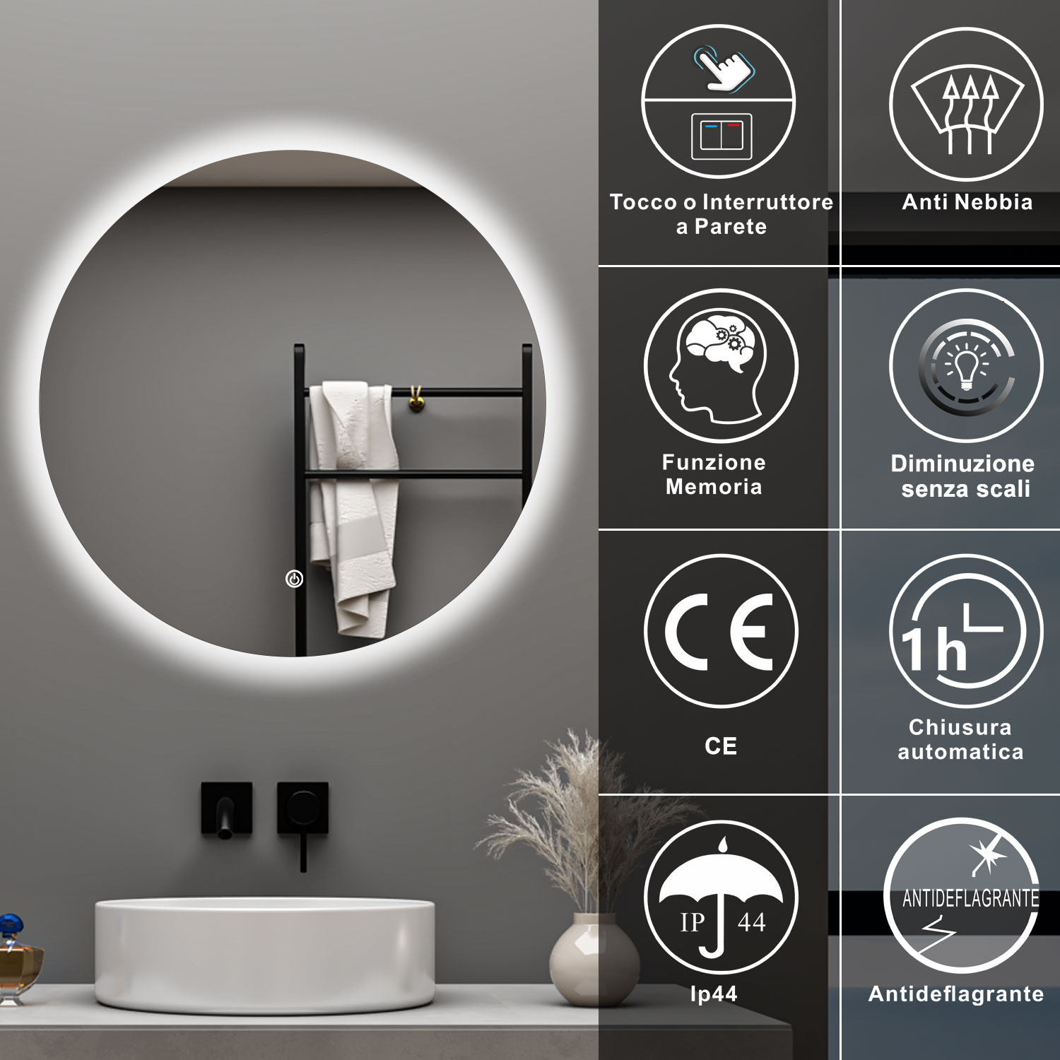 AICA 70 x 50 Specchio da bagno con LED|Rettangolare|Touch|Memoria|Dimmerabile|Retroilluminato