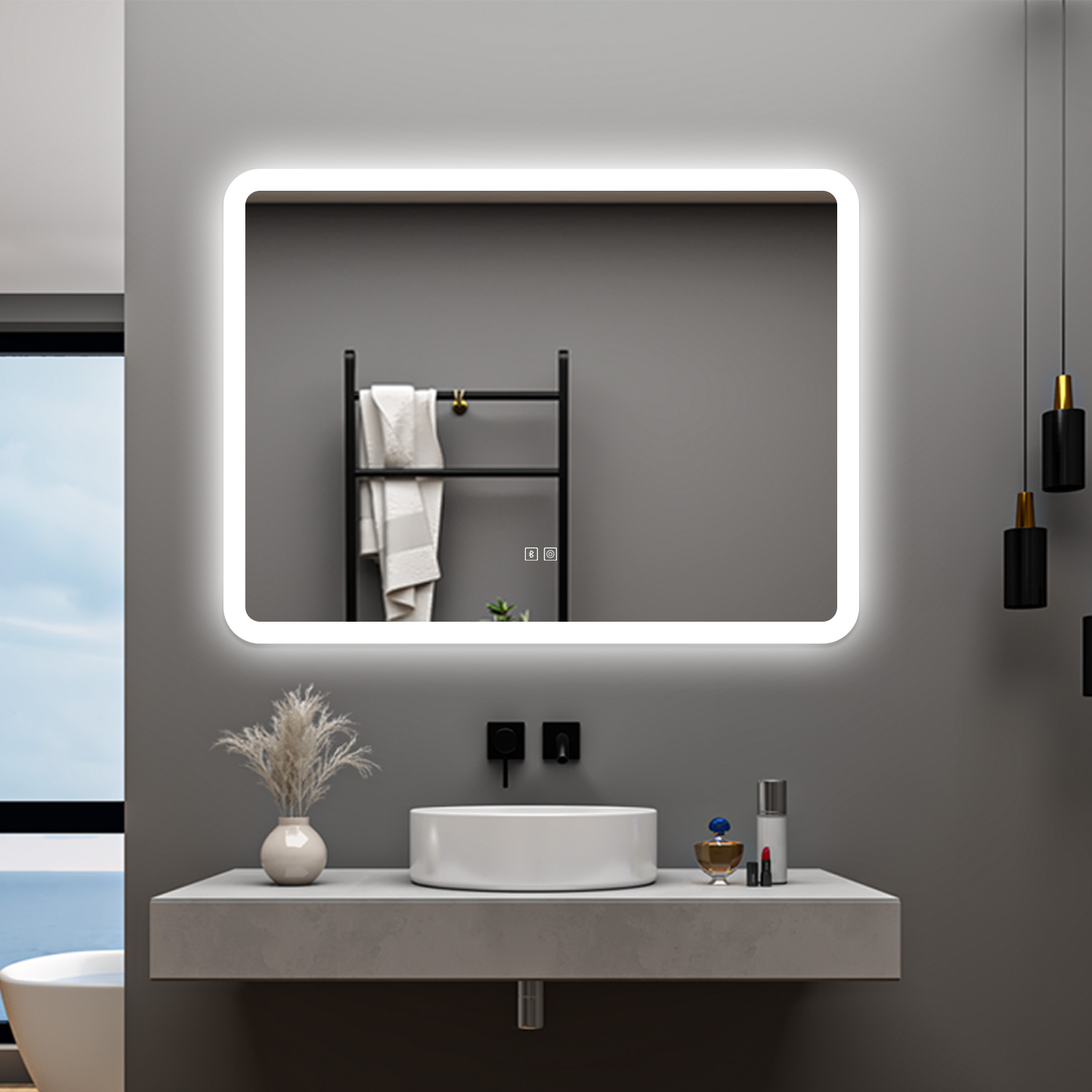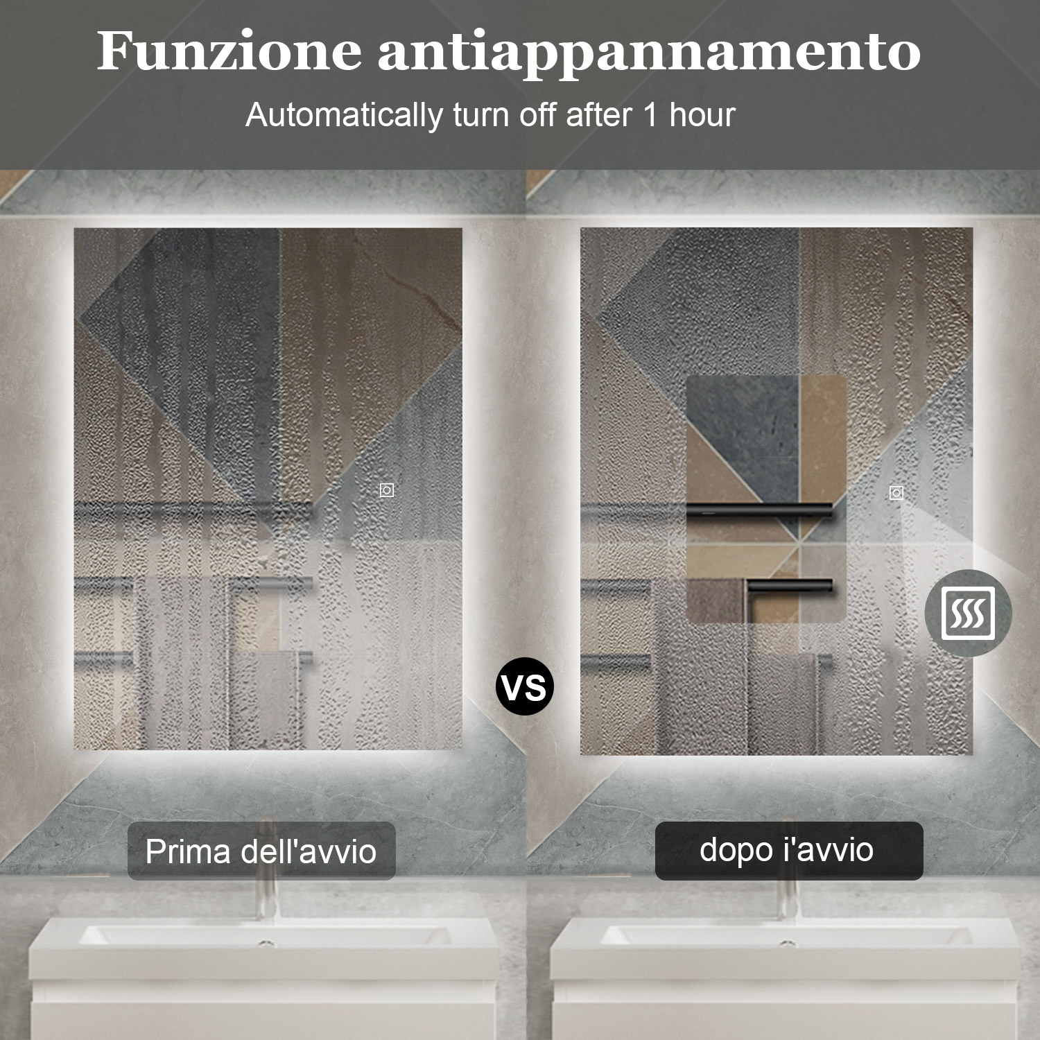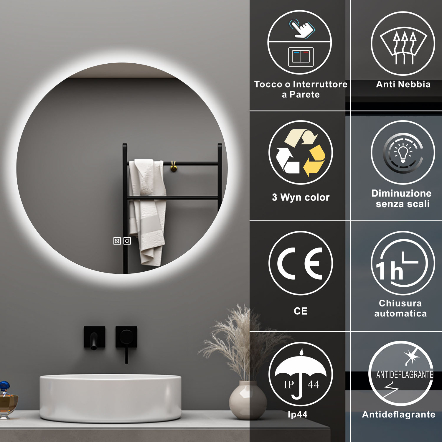 AICA 70 x 50 Specchio da bagno con LED|Rettangolare|Touch|Memoria|Dimmerabile|Retroilluminato