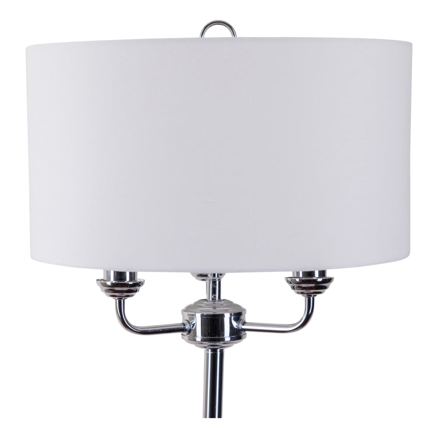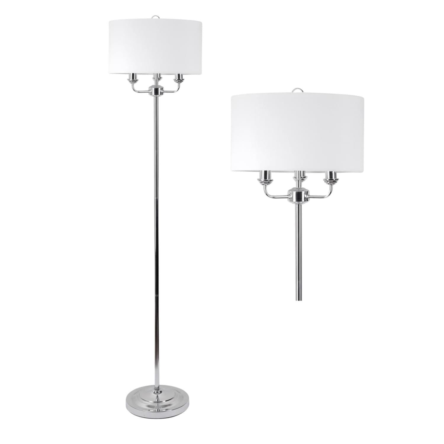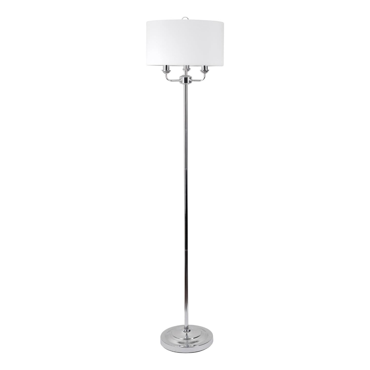 This classic triple armed floor lamp standard features a polished chrome finish and is completed with a matching light cream fabric rolled edge cylinder drum shade that makes this a perfect choice for your home.
