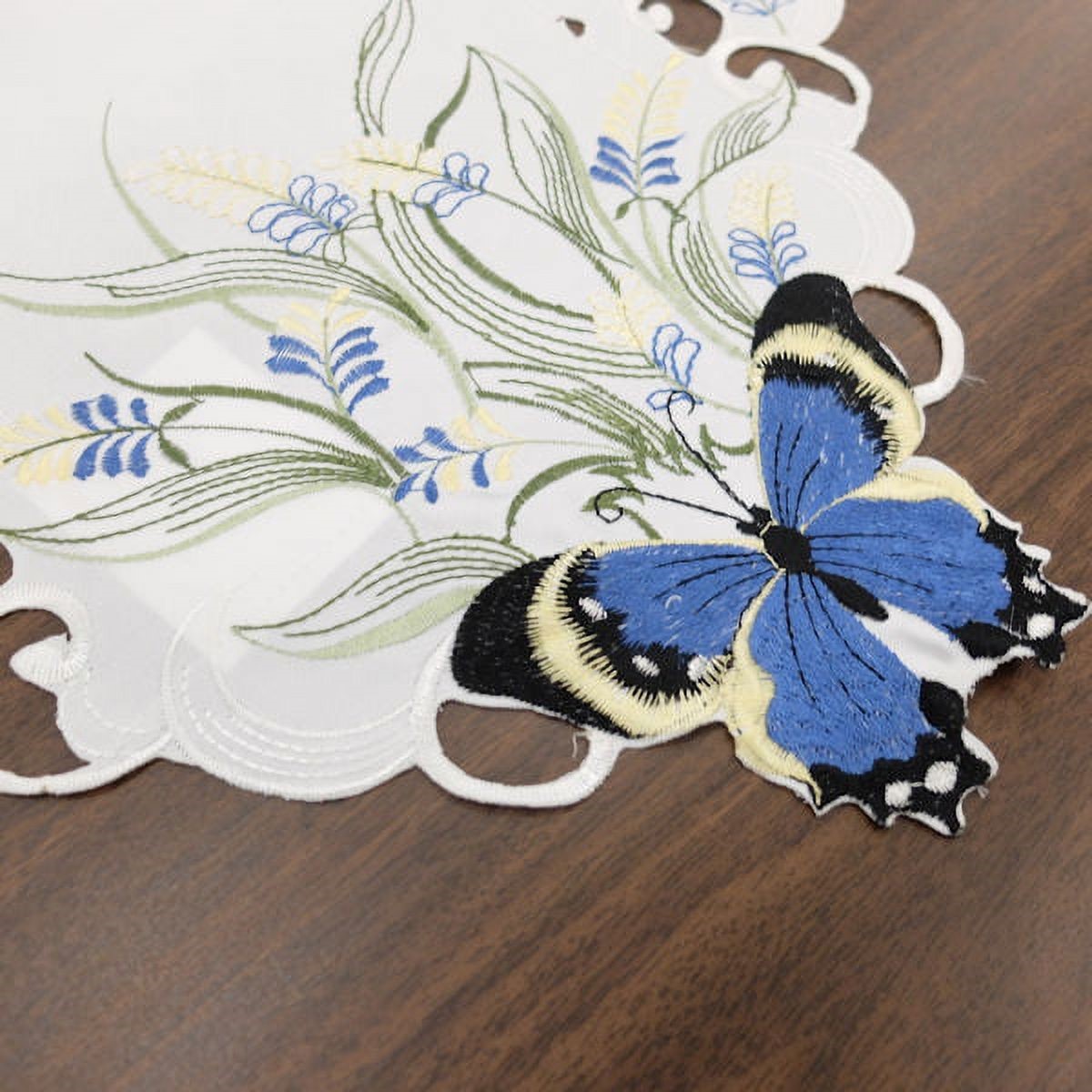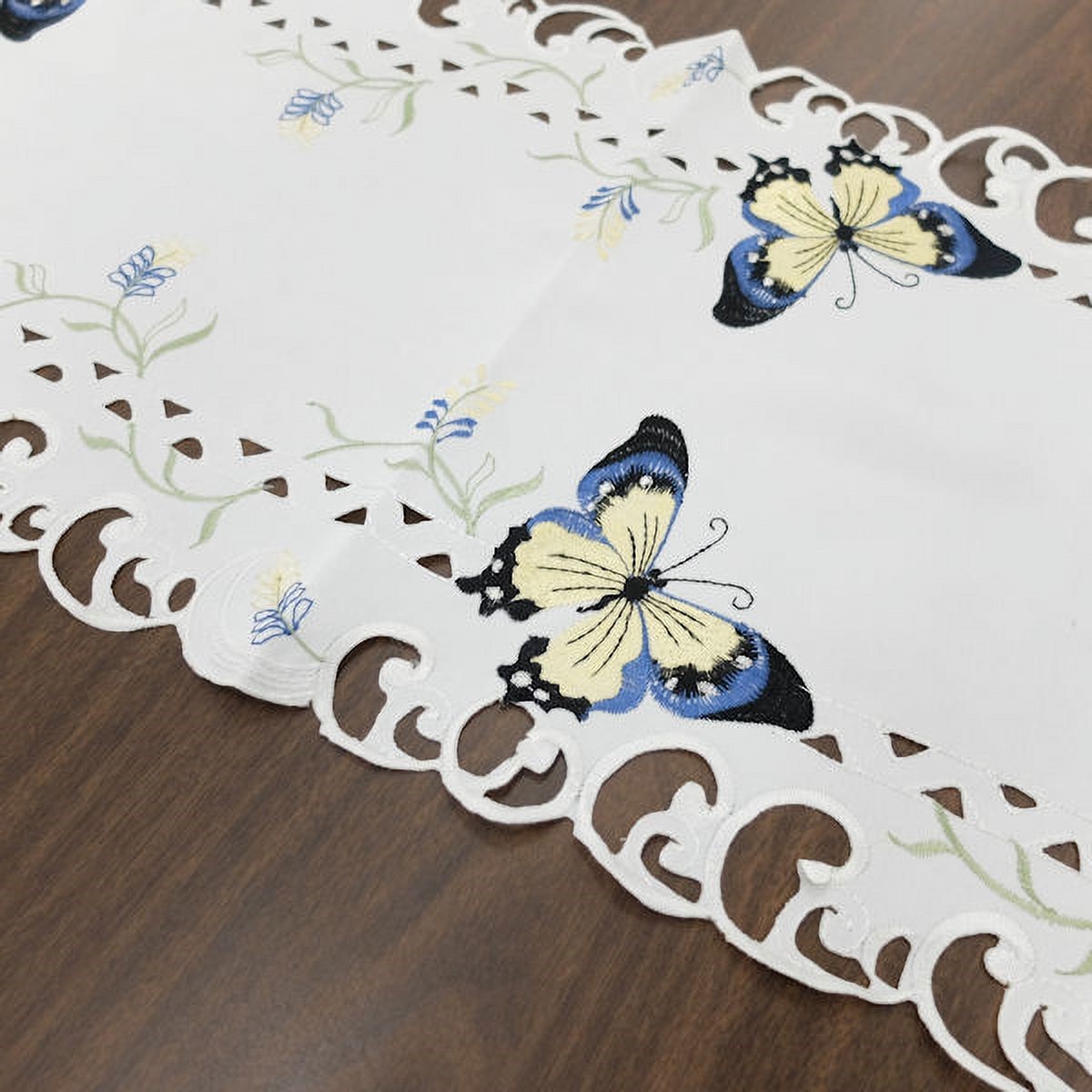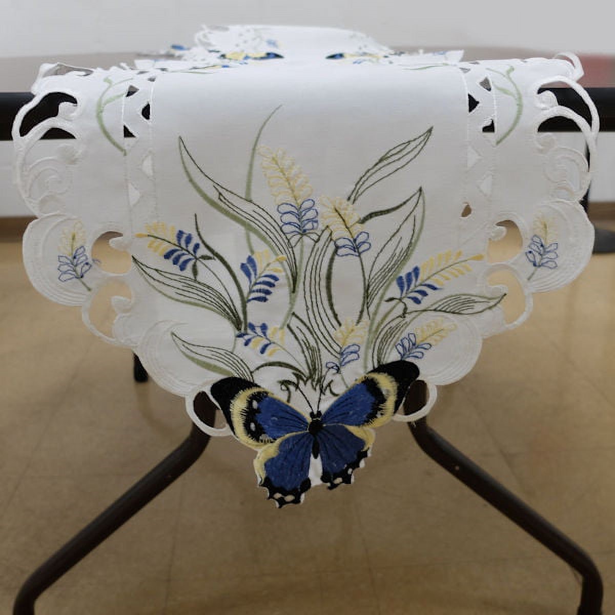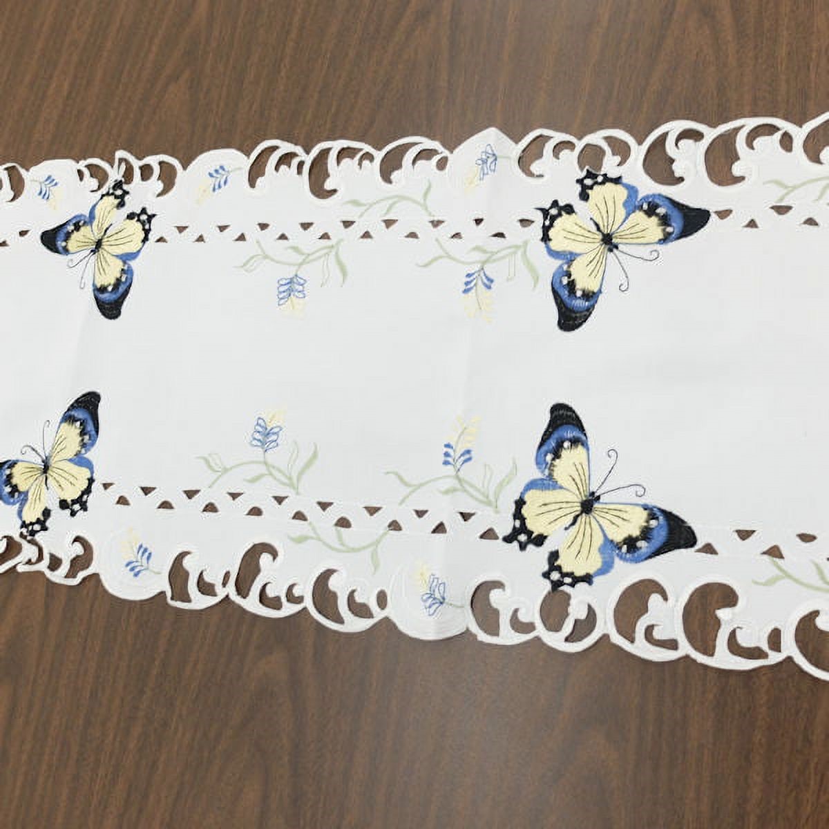 Beautiful white linens feature lovely cutwork details, embroidered blue and yellow flowers, greenery and stunning butterflies. Machine wash. Polyester; imported. 69" long x 12-1/2" wide.