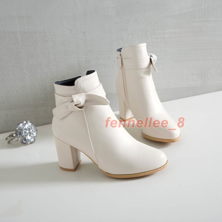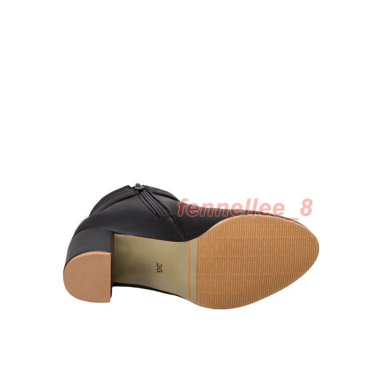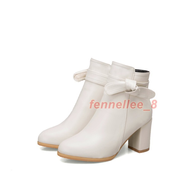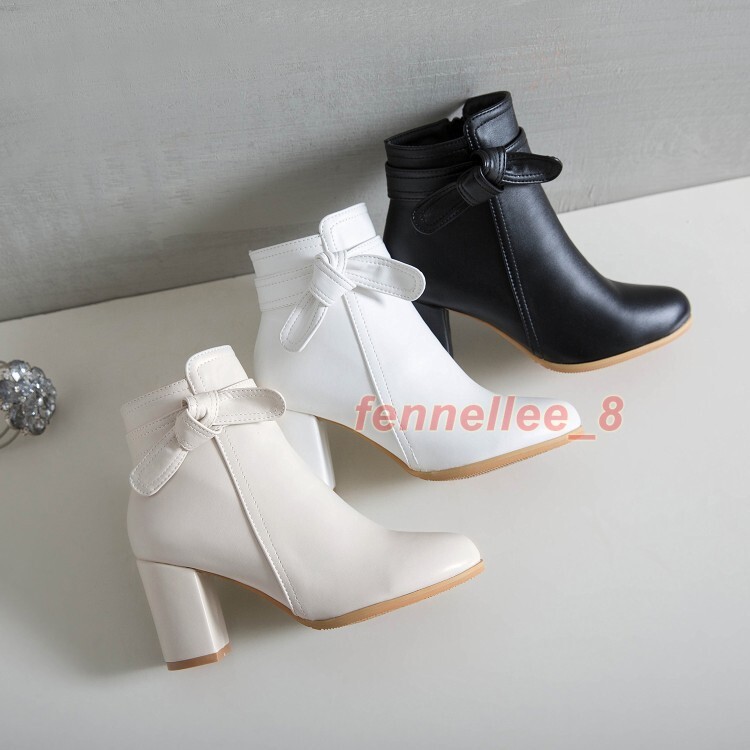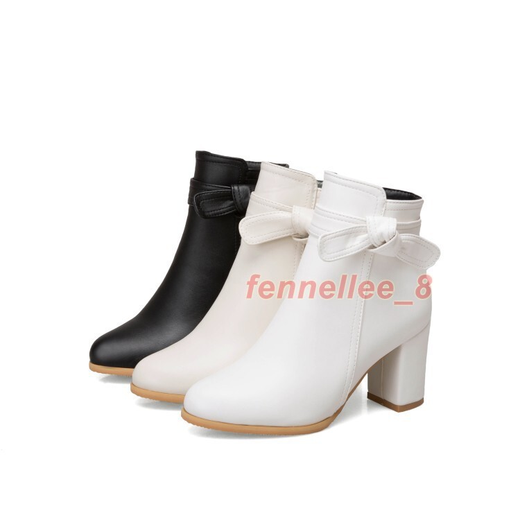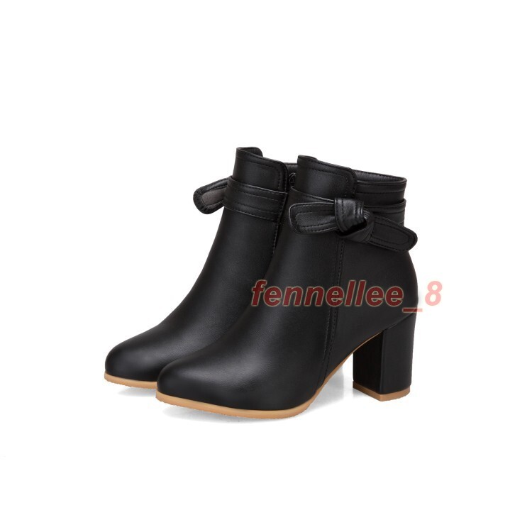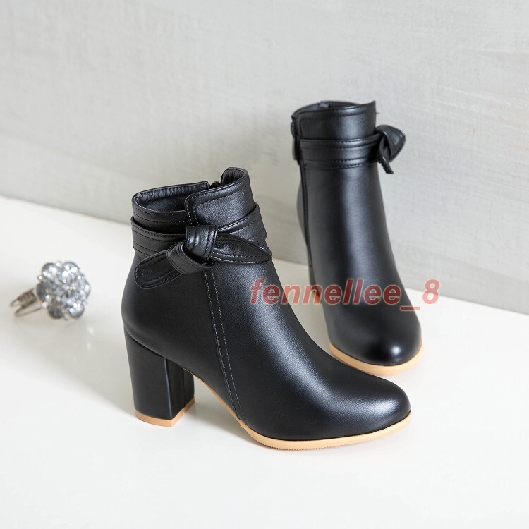 Women Faux Leather Block Mid Heels Zipper Booties Bowknot Shoes Size Ankle Boots