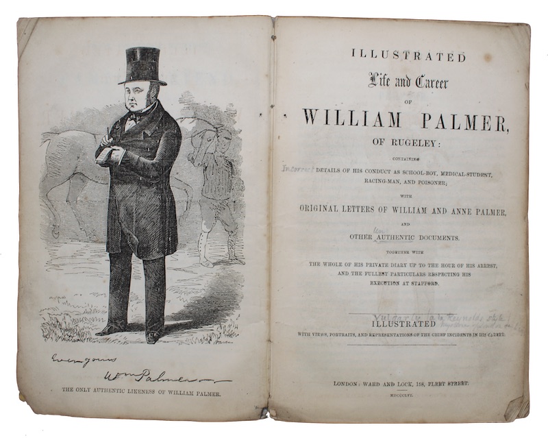 A contemporary account of the life, crimes, and trial of the infamous 'Prince of Poisoners' William Palmer (1824-1856). A doctor by trade, Palmer would be convicted of the murder by strychnine of John Cook with suspicions as to numerous other victims being raised during proceedings. The case gained a great deal of notoriety amongst Victorian society, becoming a nineteenth-century cause celebre, and permeating into popular culture. Arthur Conan Doyle would make reference to Palmer in the Sherlock Holmes tale 'The Adventure of the Speckled Band'; and Charles Dickens reputedly based the Bleak House character of Inspector Bucket on an investigating officer involved - indeed Dickens would dub Palmer 'the greatest villain that ever stood in the Old Bailey'.