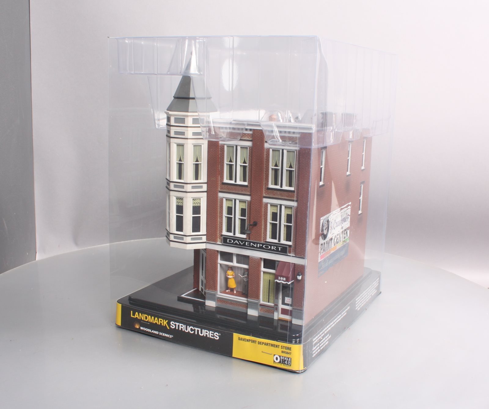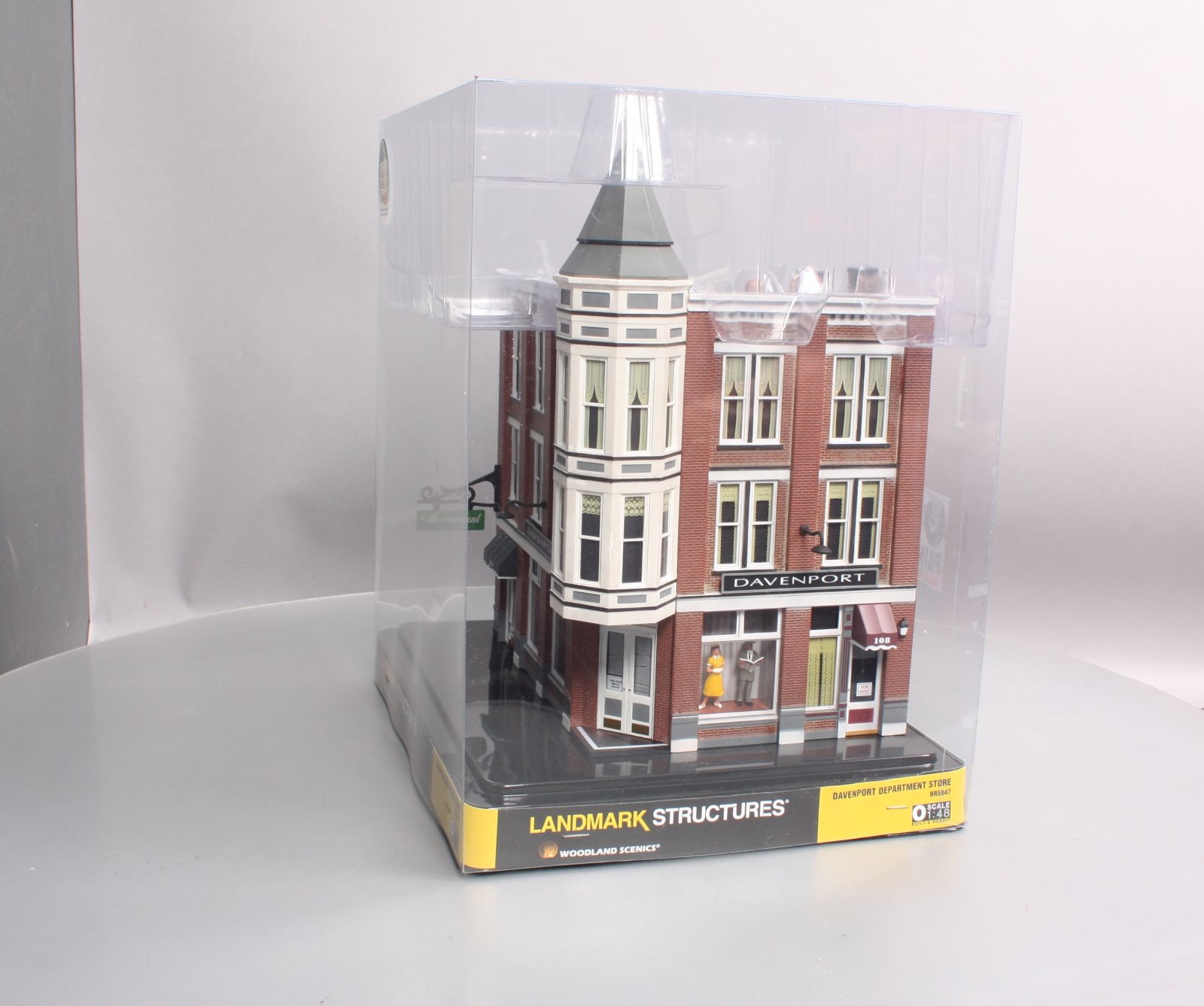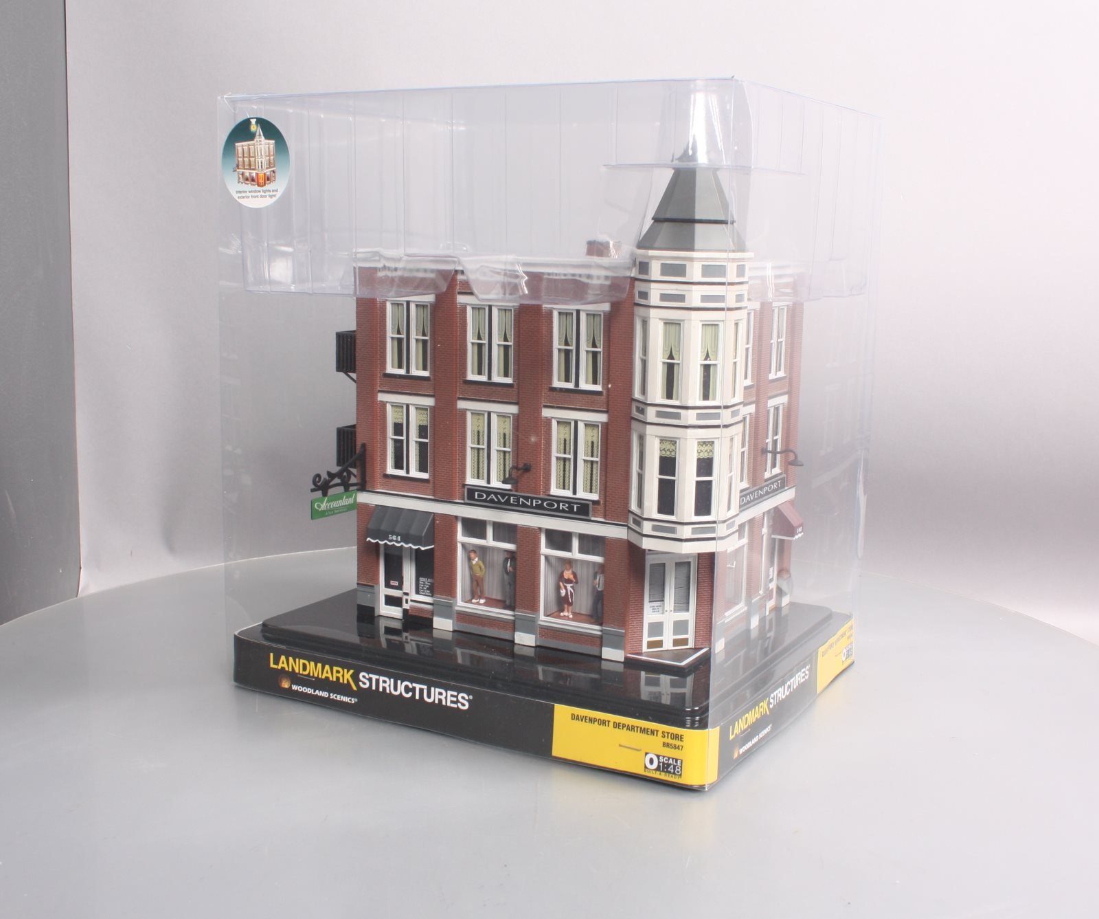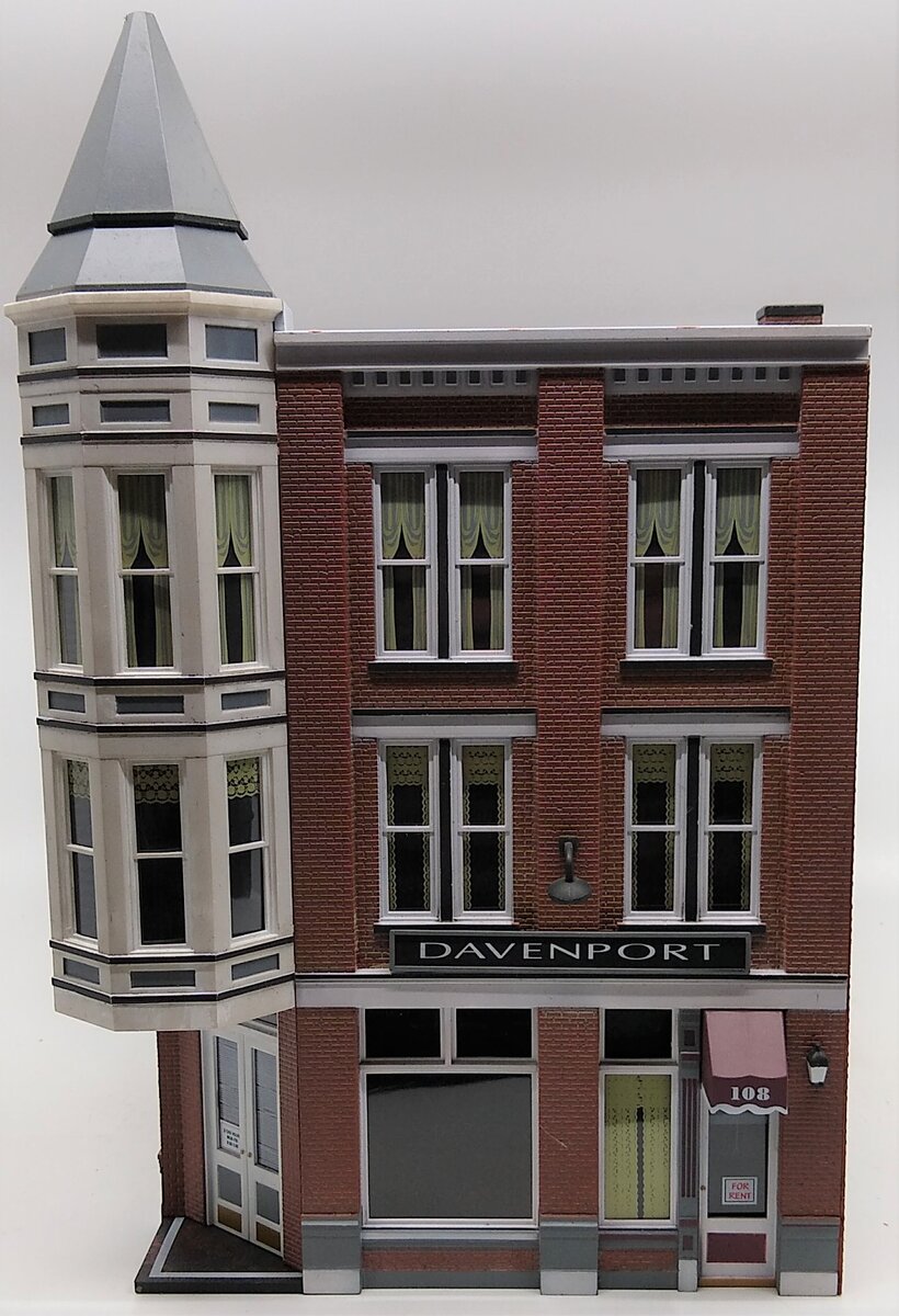 Here is a Woodland Scenics BR5847 O Scale Built-&-Ready Davenport Department Store Building. The classic Victorian architecture and two-story corner turret of this three-story corner department store will dress up any downtown area. It features large, first-floor picture windows with mannequins, and the second and third floor windows feature a variety of window treatments. Other details include roof-top accessories, wrought-iron balconies and fire escape, signage, awnings and light fixtures. Building includes printed interior and four LED lights, two white interior and two amber-colored exterior.