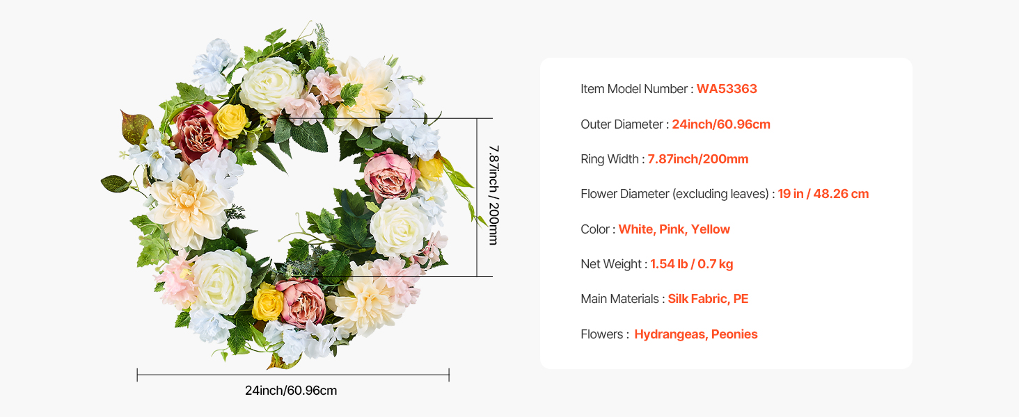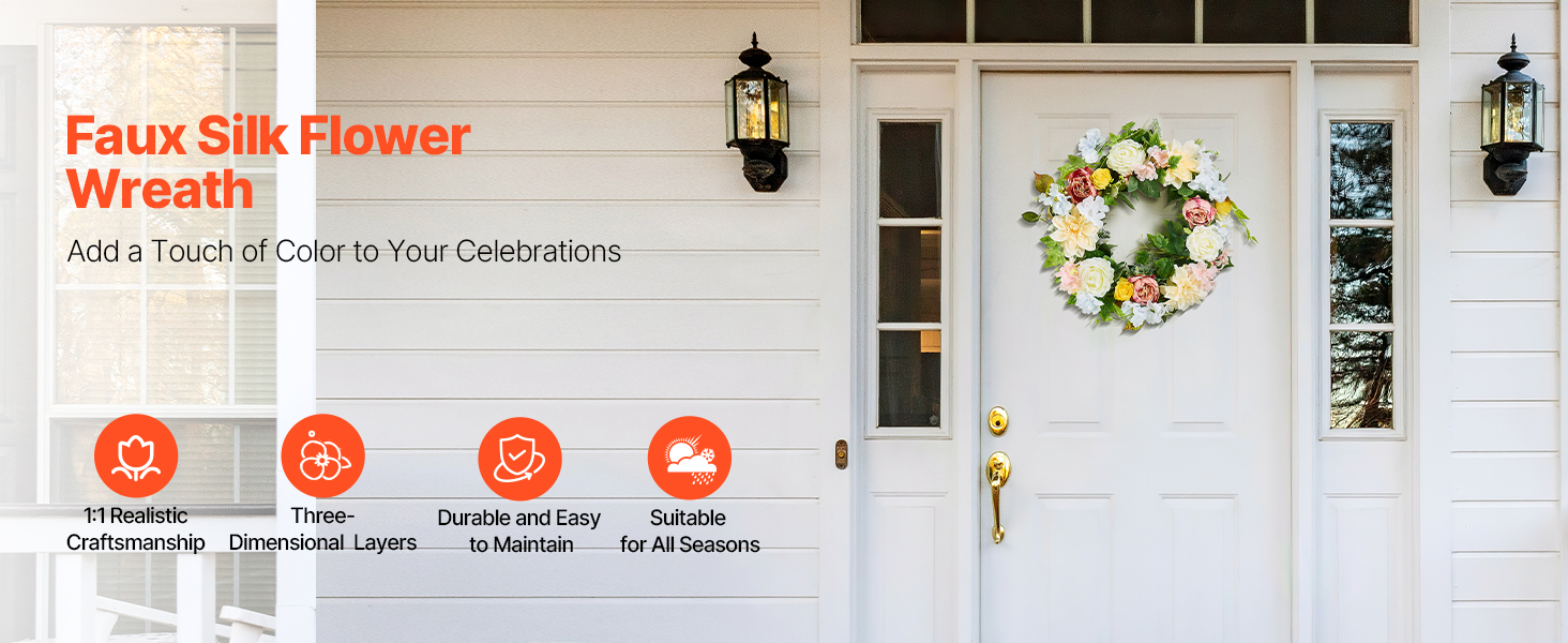 Premium Silk Fabric: This all-season wreath’s flowers have vibrant, long-lasting colors. The material is durable, easy to clean, and fade-resistant, making it suitable for long-term use. It is soft and realistic in appearance.