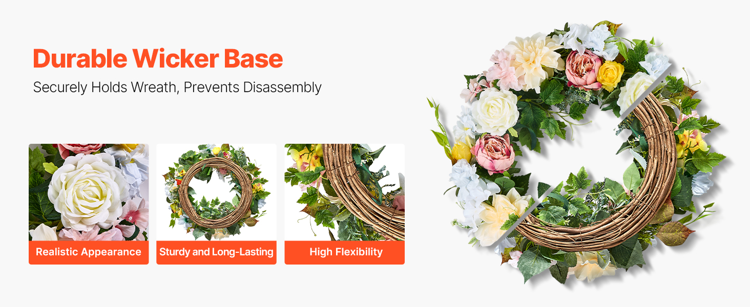 Made from high-quality wicker, this all-season wreath’s base features a realistic appearance and sturdy structure. It provides a solid foundation for your creative decorations, maintaining beauty and stability for long-lasting use, whether for home decor or special occasions.