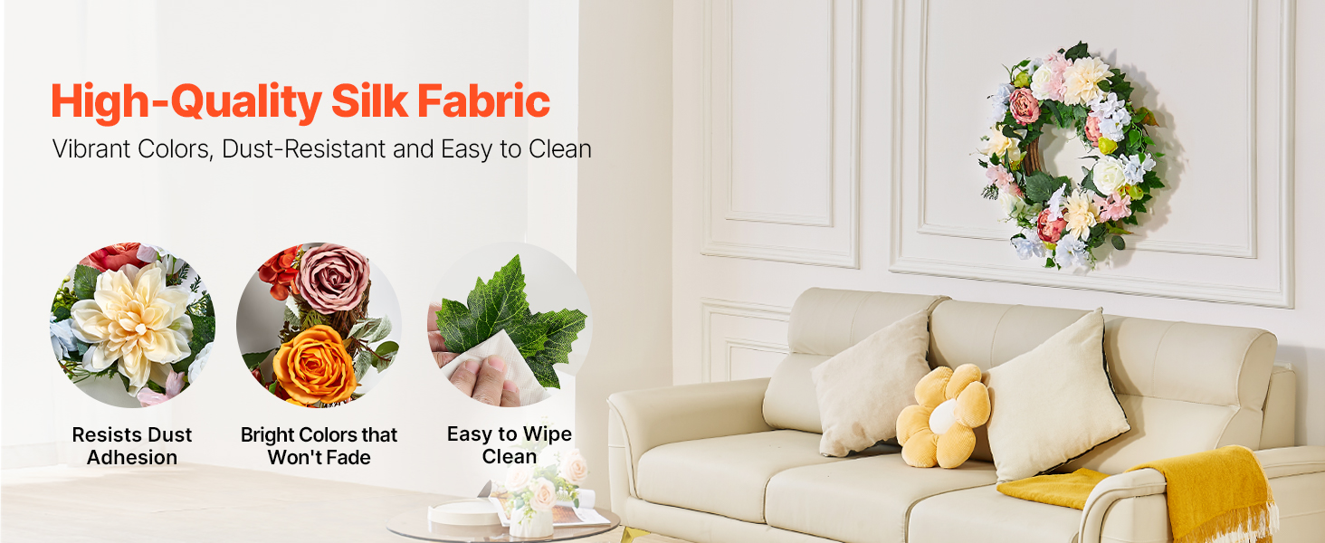 Crafted from high-quality silk fabric, this front door wreath’s surface is smooth and dust-resistant, maintaining vibrant colors without fading over time. It can be gently wiped with a damp cloth or washed, making it suitable for long-term decoration in various settings.