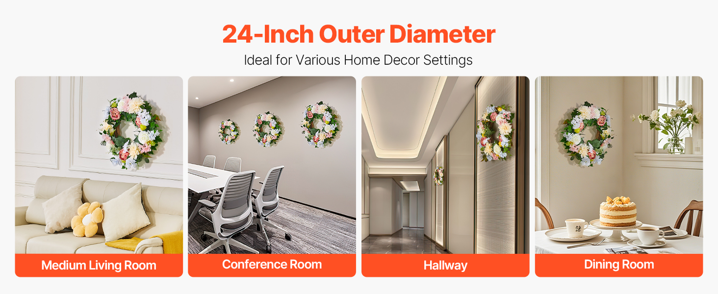 With an outer diameter of approximately 24 in, this faux wreath is ideal for decorating medium living rooms, dining rooms, conference rooms, hallways, and other home spaces, adding a touch of natural elegance to your home.