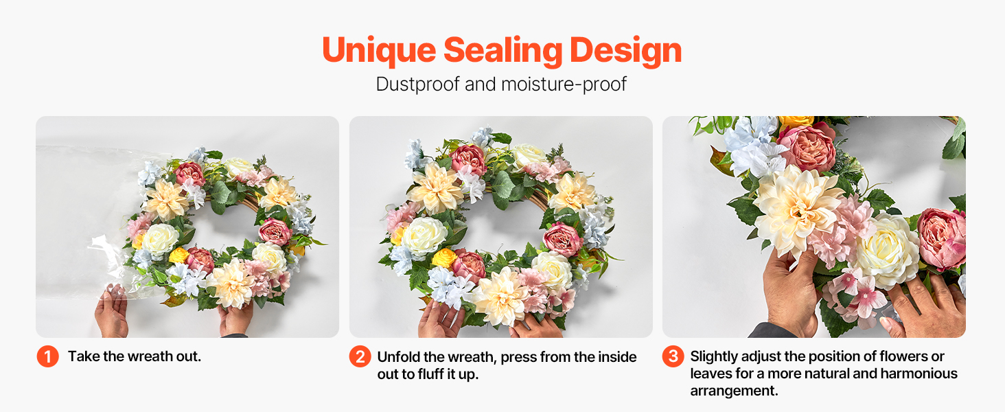 Please take out the indoor wreath and unfold it. Press from the inside out. Straighten each flower and leaf, ensuring an even, entire appearance. Install hooks or nails at the desired location, then hang the wreath to complete the decoration. Simple steps can beautify your space.