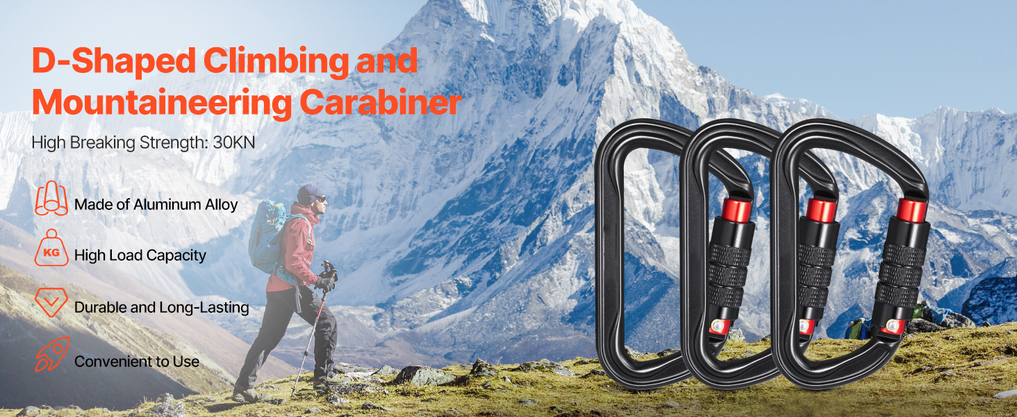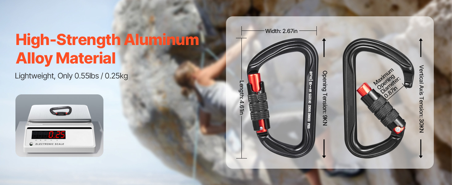 Durable and Strong: The heavy duty carabiner is made of premium 7075 aerospace-grade aluminum, ensuring strength, durability, and rust resistance. The main axis strength is 30kN (6744 lbs), with a lateral load of 9kN (2023 lbs) and an open-load strength of 9kN (2023 lbs). The classic D-shape design directs most of the load to the spine, providing enhanced safety and reliability