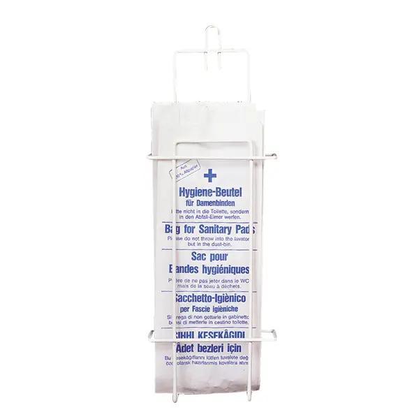 Diese Halterung bietet eine diskrete und praktische Lösung zur Aufbewahrung von Hygienebeuteln in Sanitärbereichen. Mit einer weißen Beschichtung versehen, integriert sich das Drahtgestell unauffällig in das Interieur von Damentoiletten und gewährleistet durch seine Wandmontage eine platzsparende und griffbereite Positionierung der Beutel.