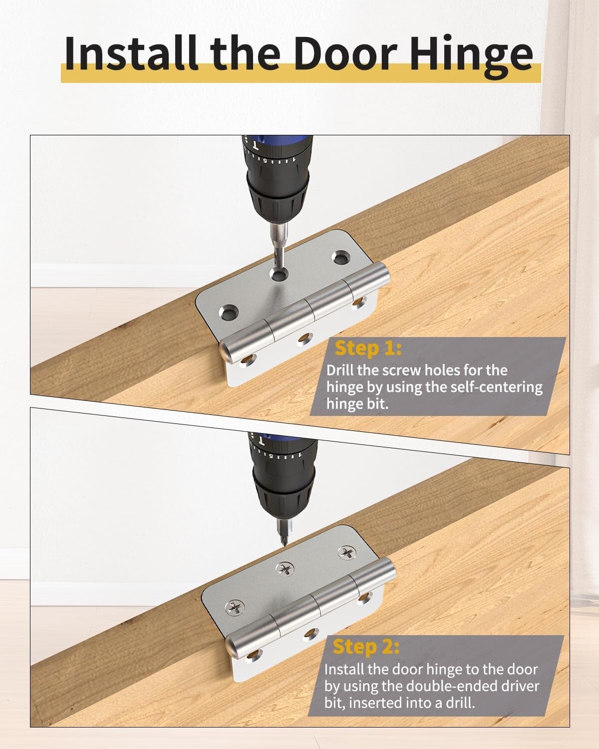 Seamless Installation: Drill screw holes effortlessly using the self-centering hinge bit. Install your door hinge quickly with the double-ended driver bit attached to any drill.