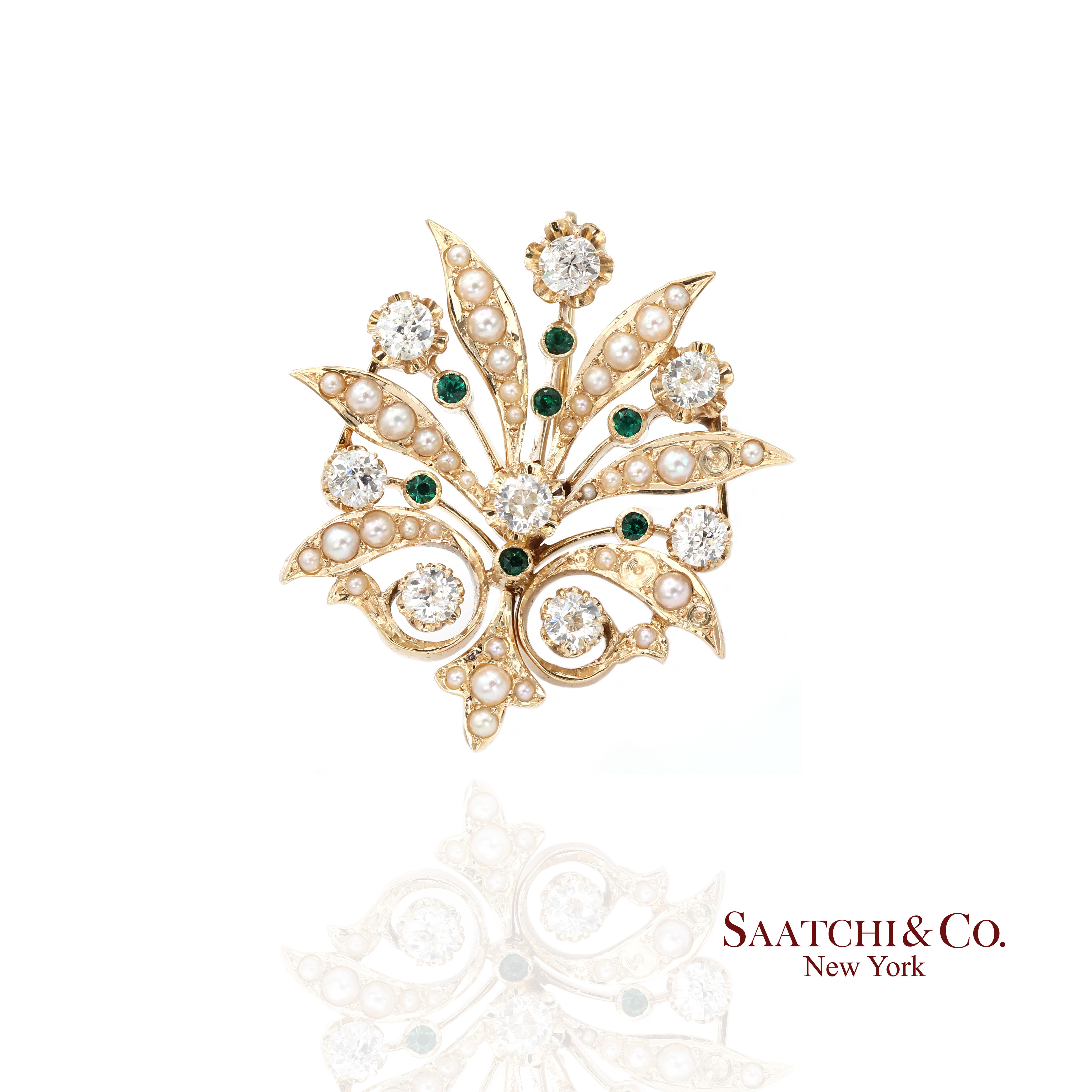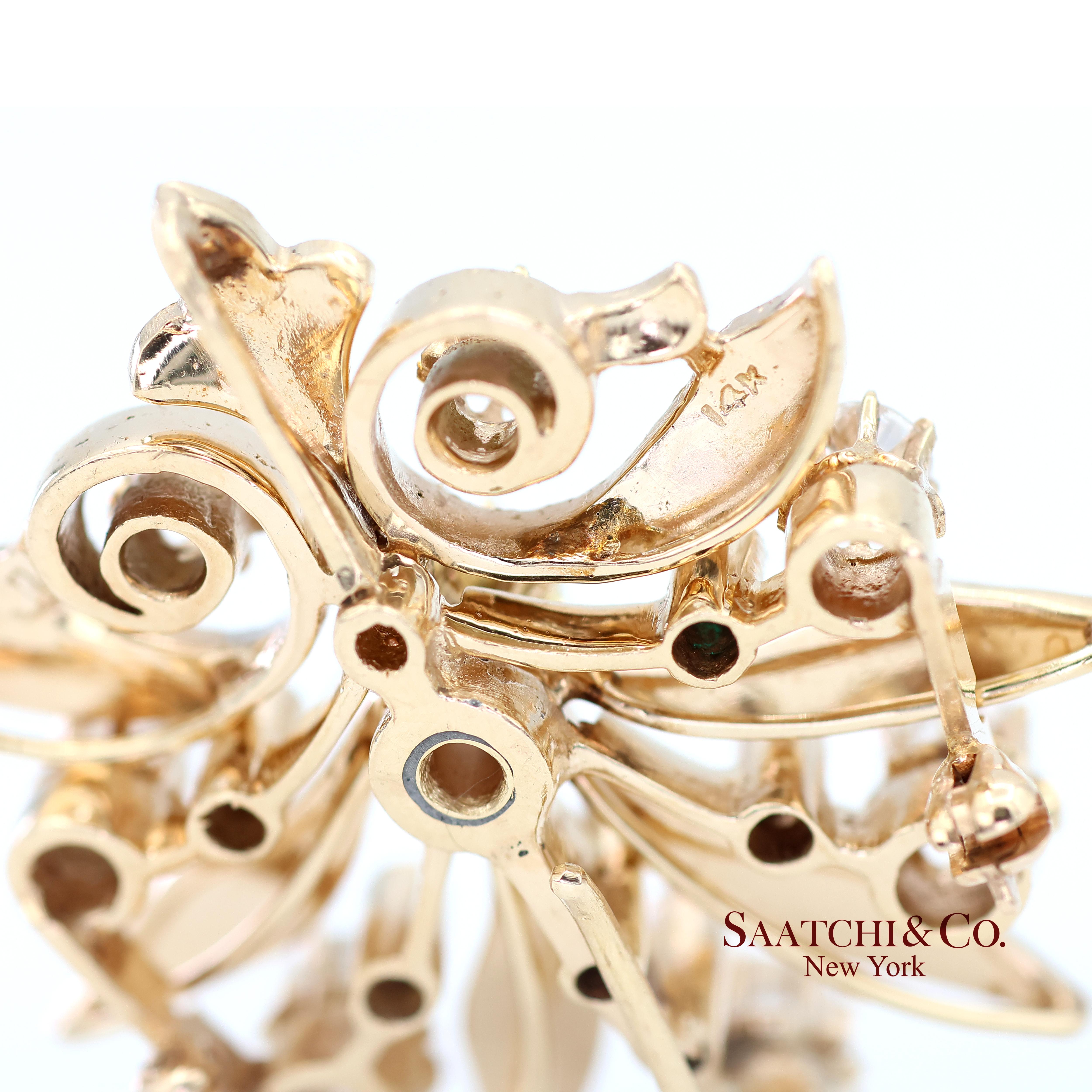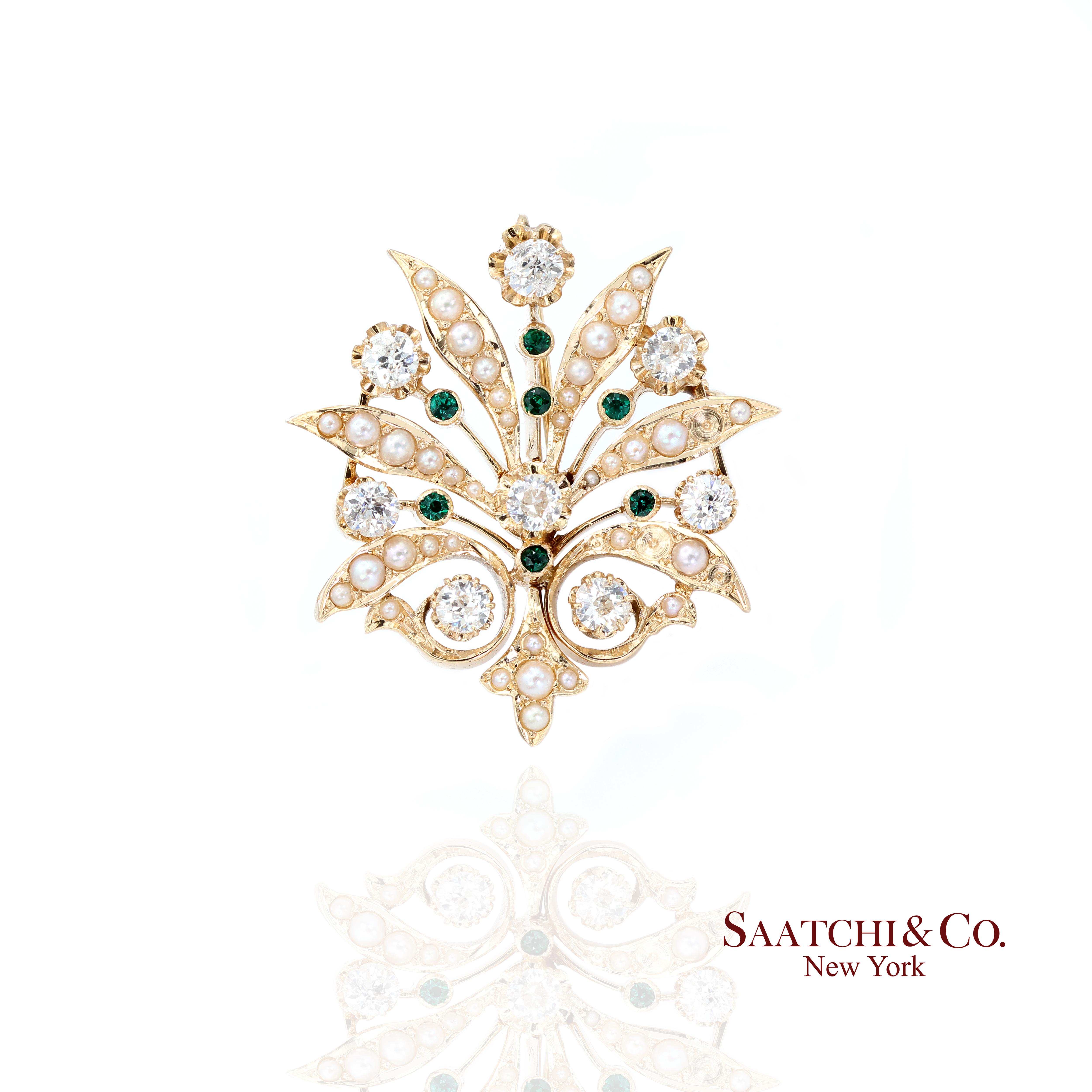14k (585) Vintage Yellow Gold Natural Diamond and Emerald Brooch / Pendant