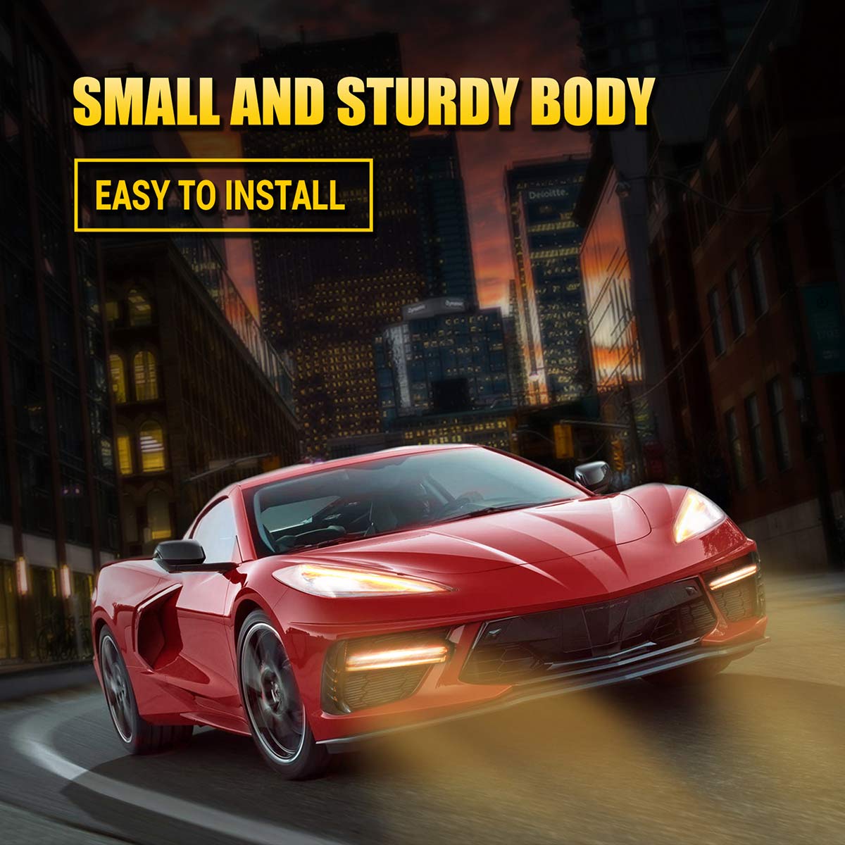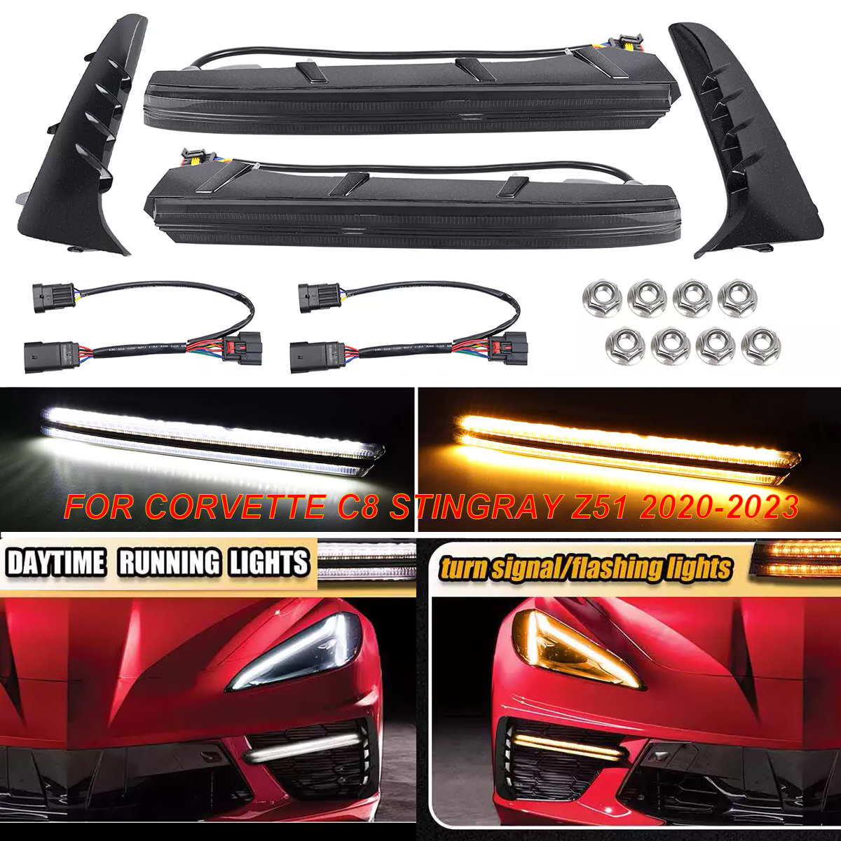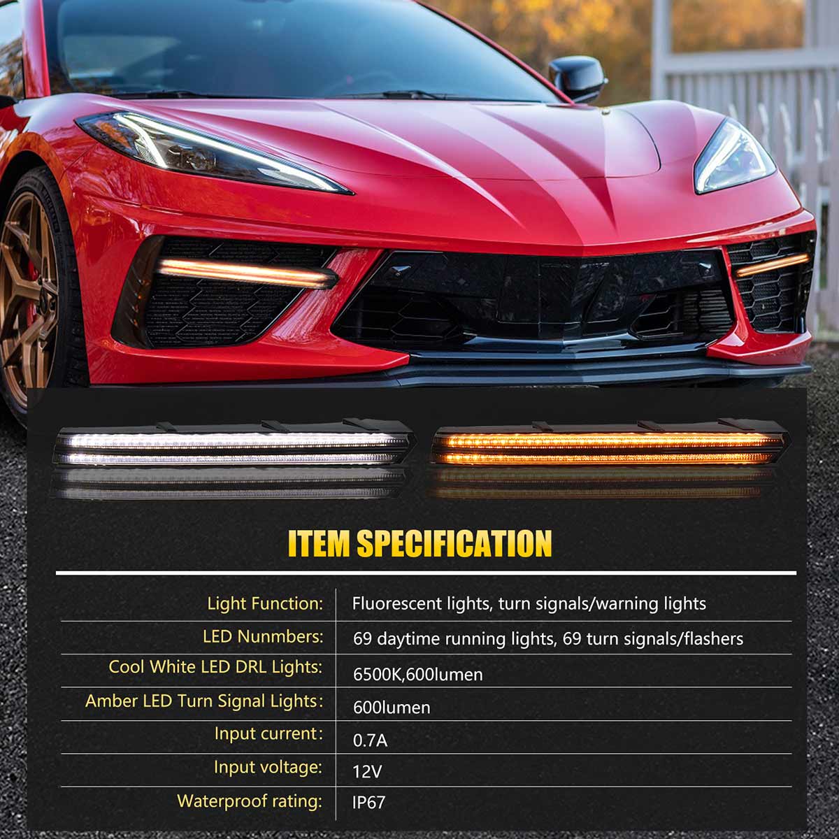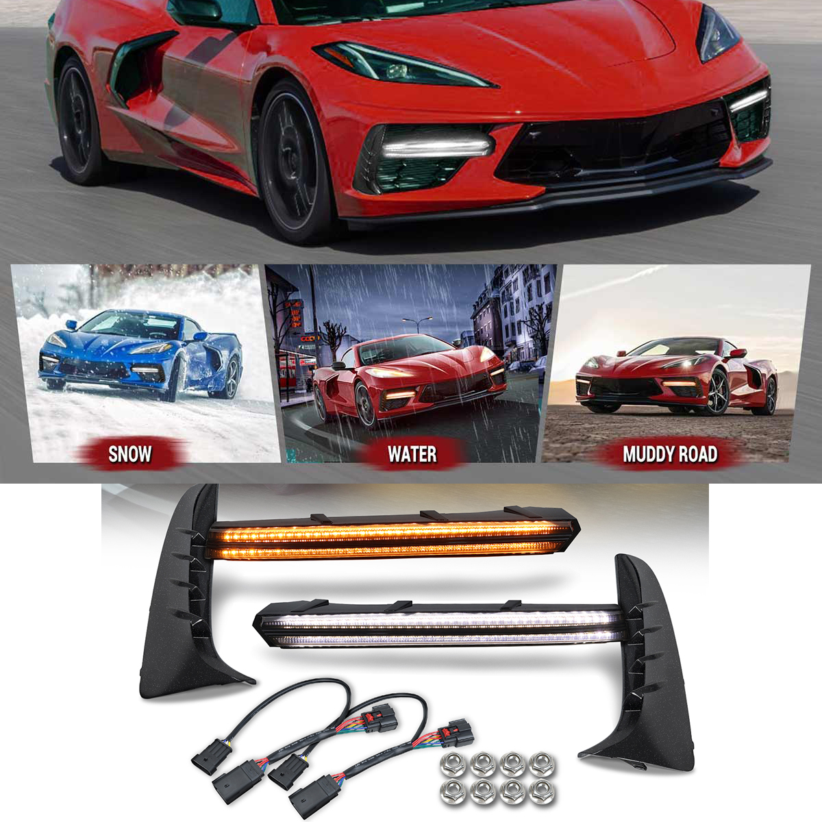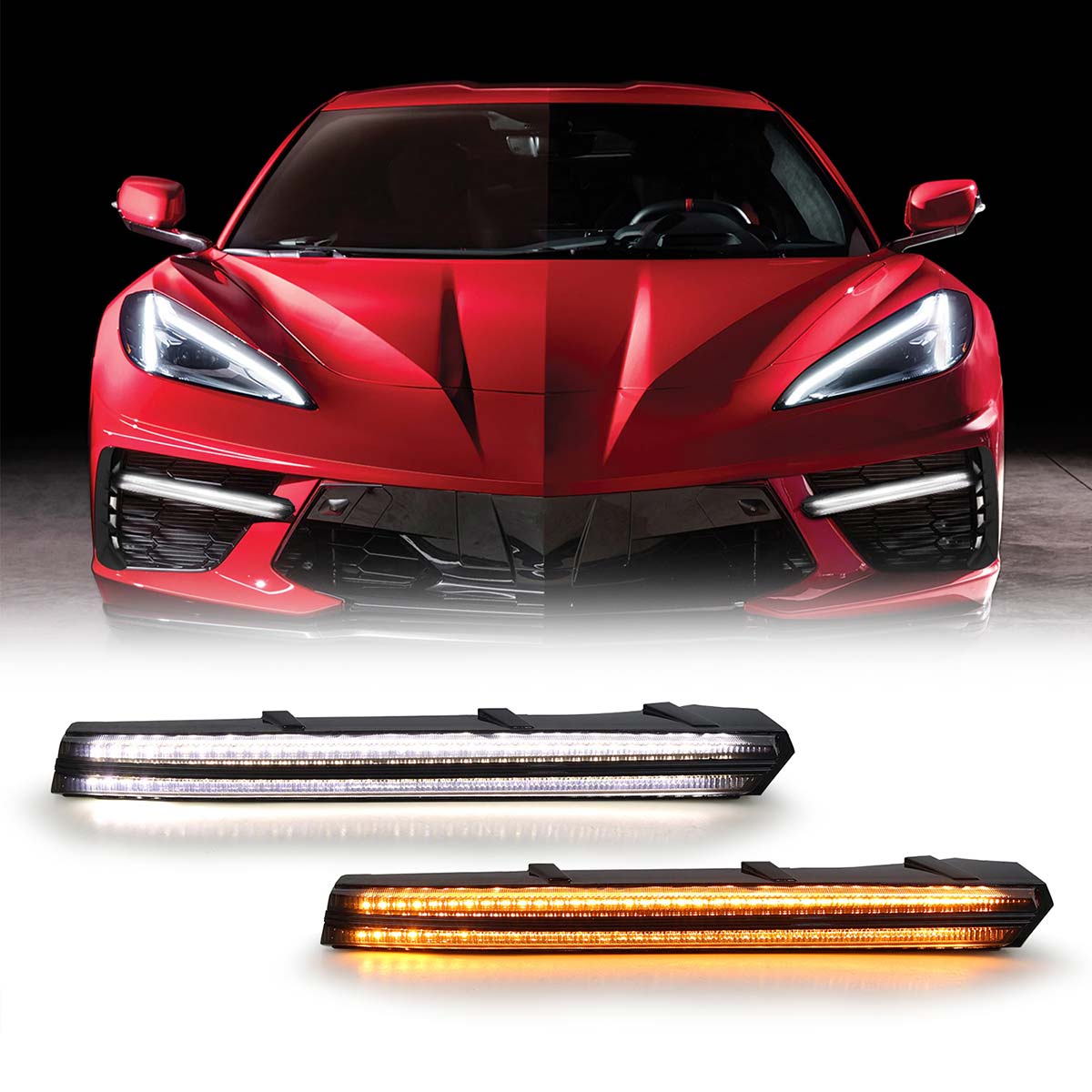 The LED grille bezel light bars fit for Corvette C8 Stingray (1LT, 2LT, 3LT) Z51 2020-2025, not fit for Corvette C8 Z06 HTC (Please note this product is designed for OEM headlights & not designed to be used with any aftermarket headlight modifications), Increase visibility for yourself and others with these dual function, A smoked gloss black lens is molded into a custom grille bezel for a OEM like fitting piece