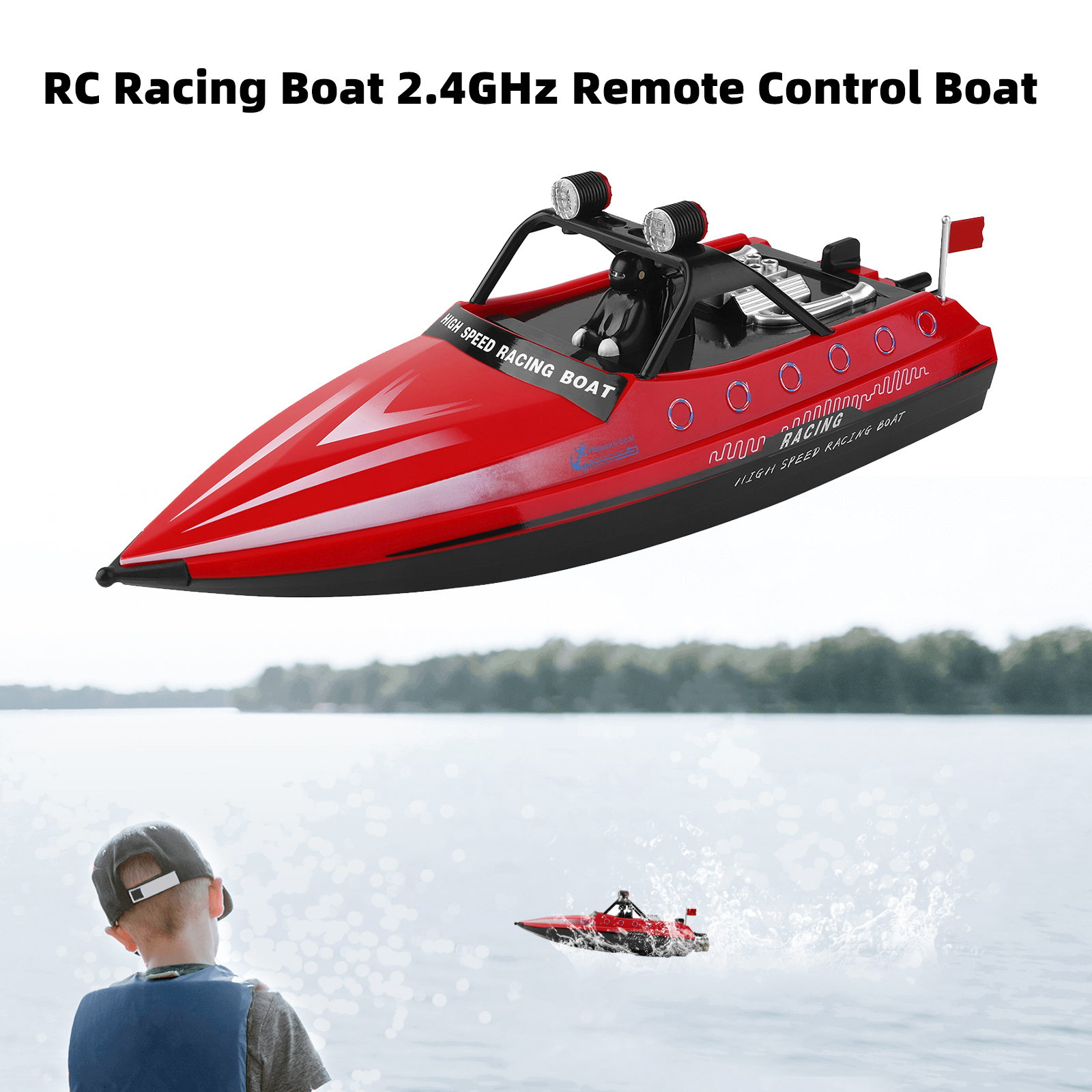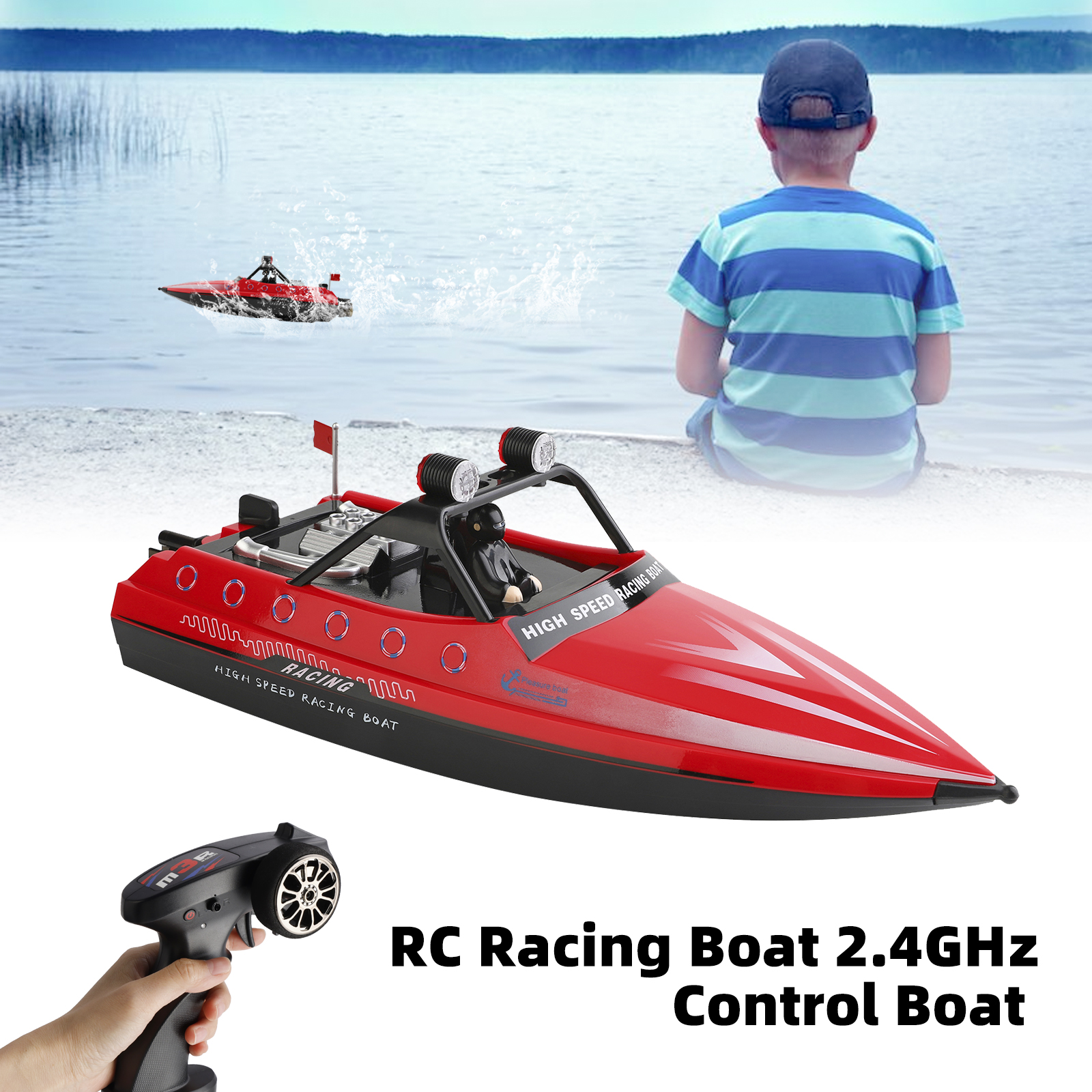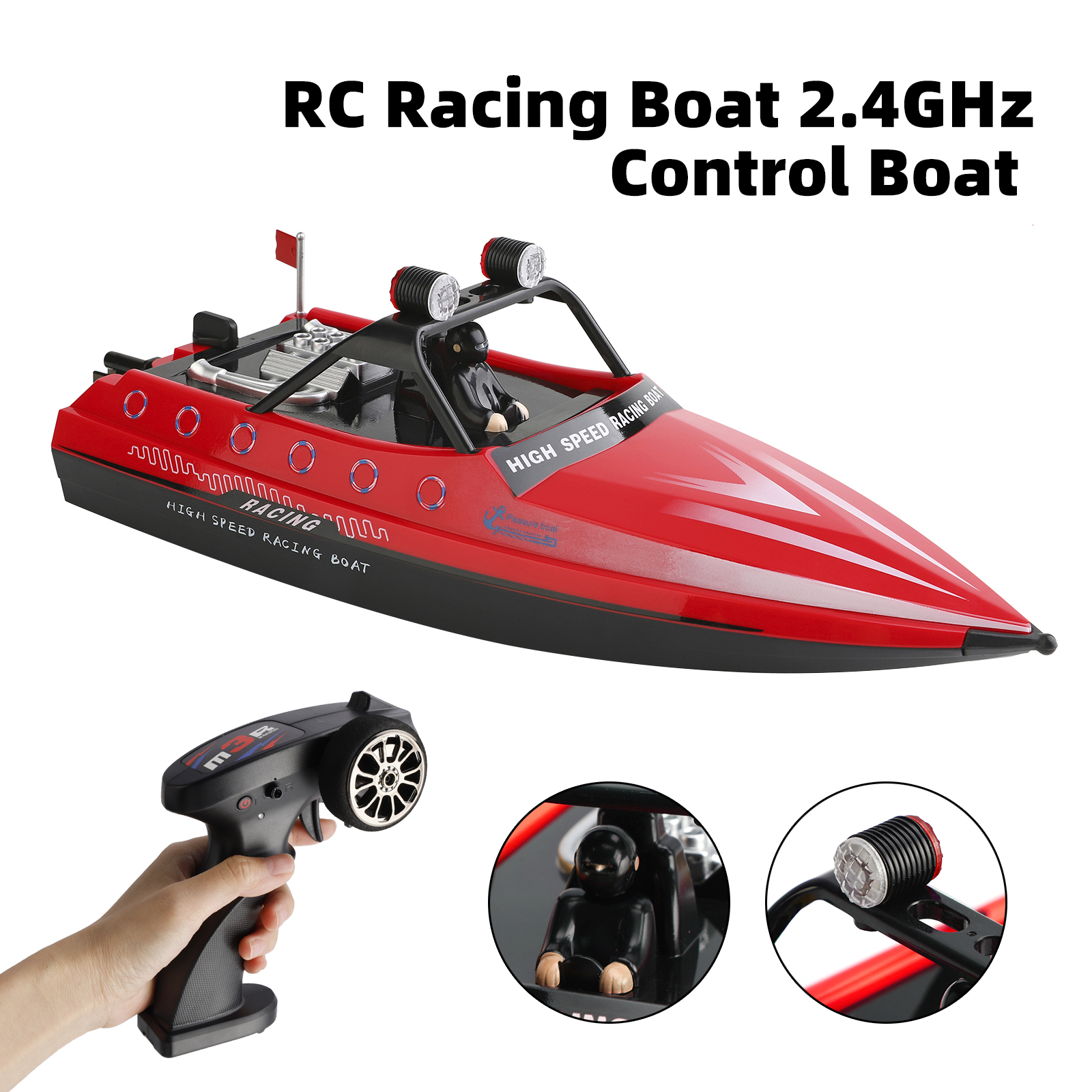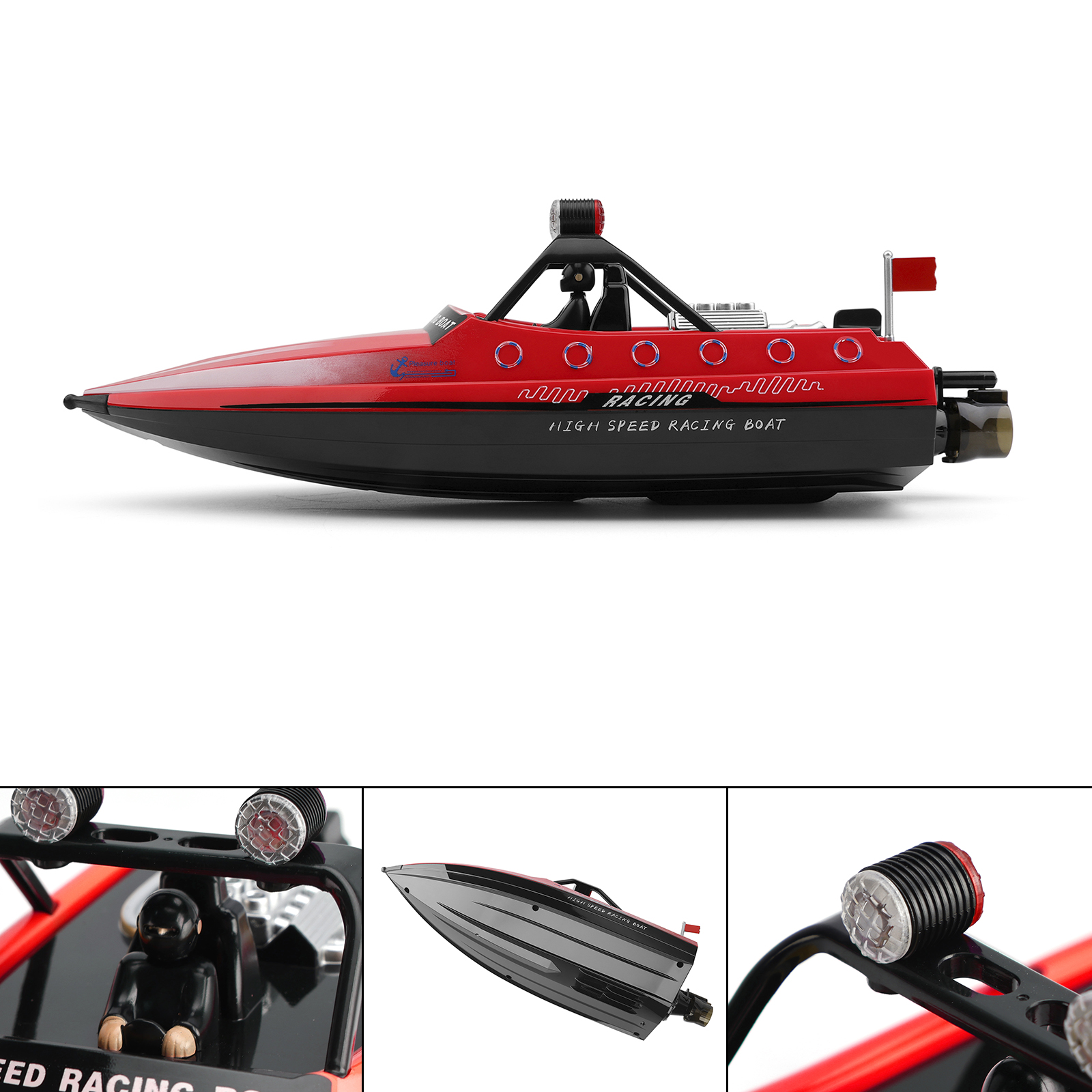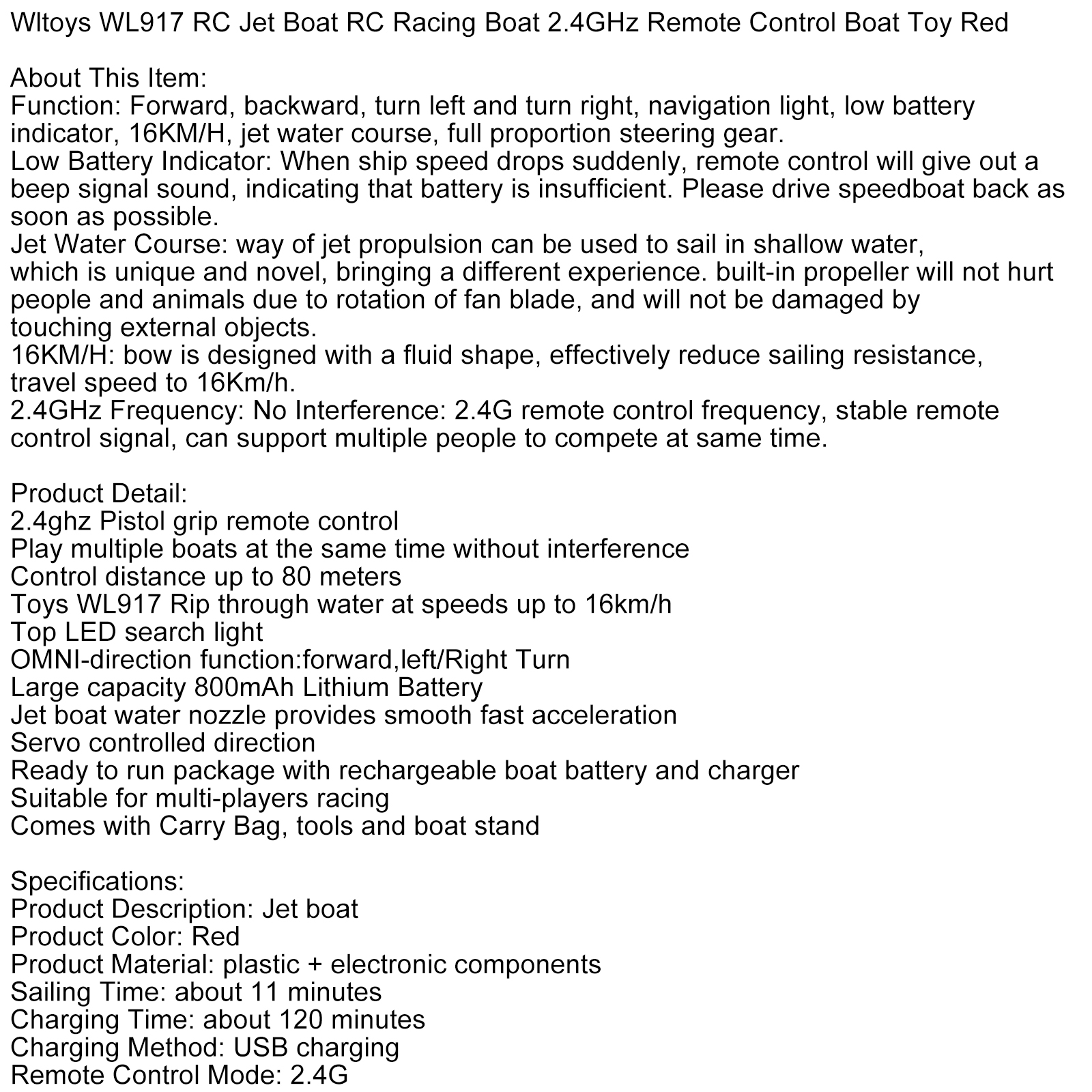 Function: Forward, backward, turn left and turn right, navigation light, low battery indicator, 16KM/H, jet water course, full proportion steering gear.