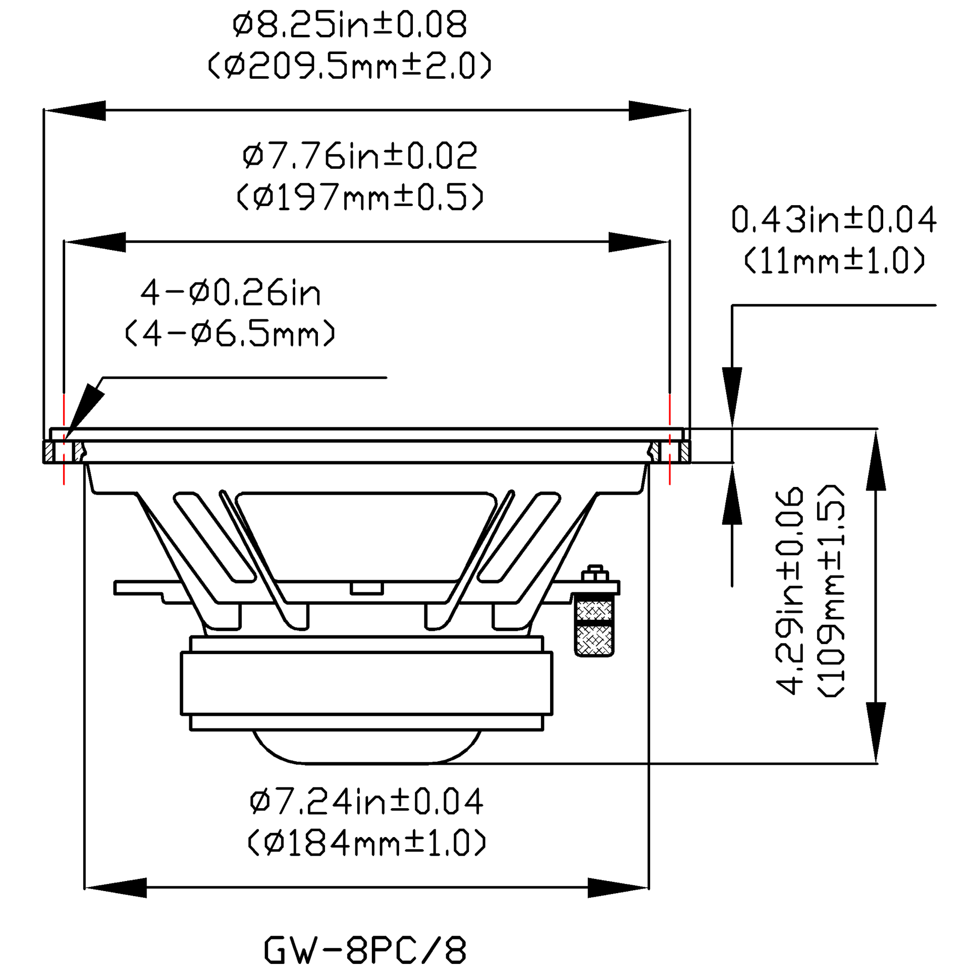 Overall Dimension is 8.25" per woofer