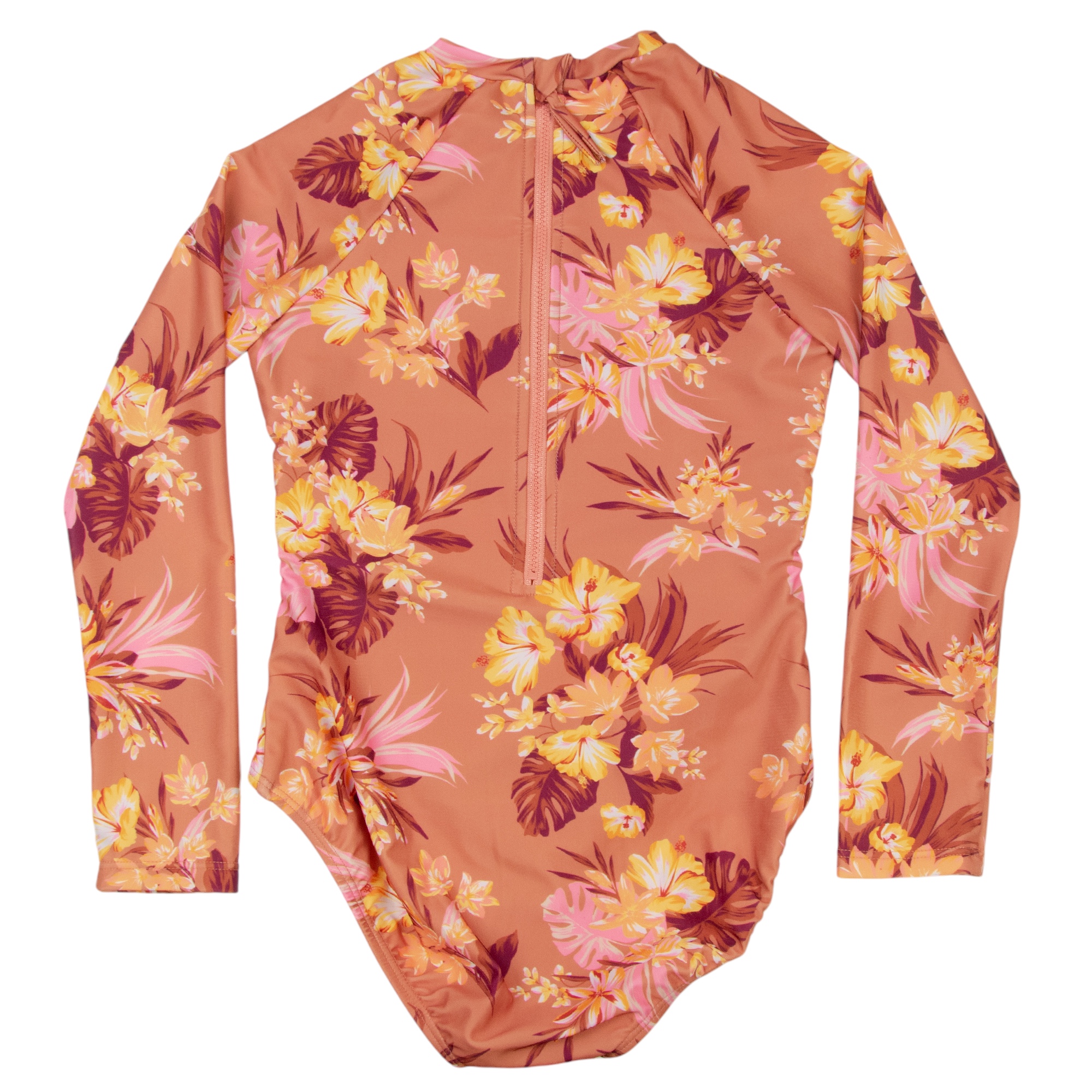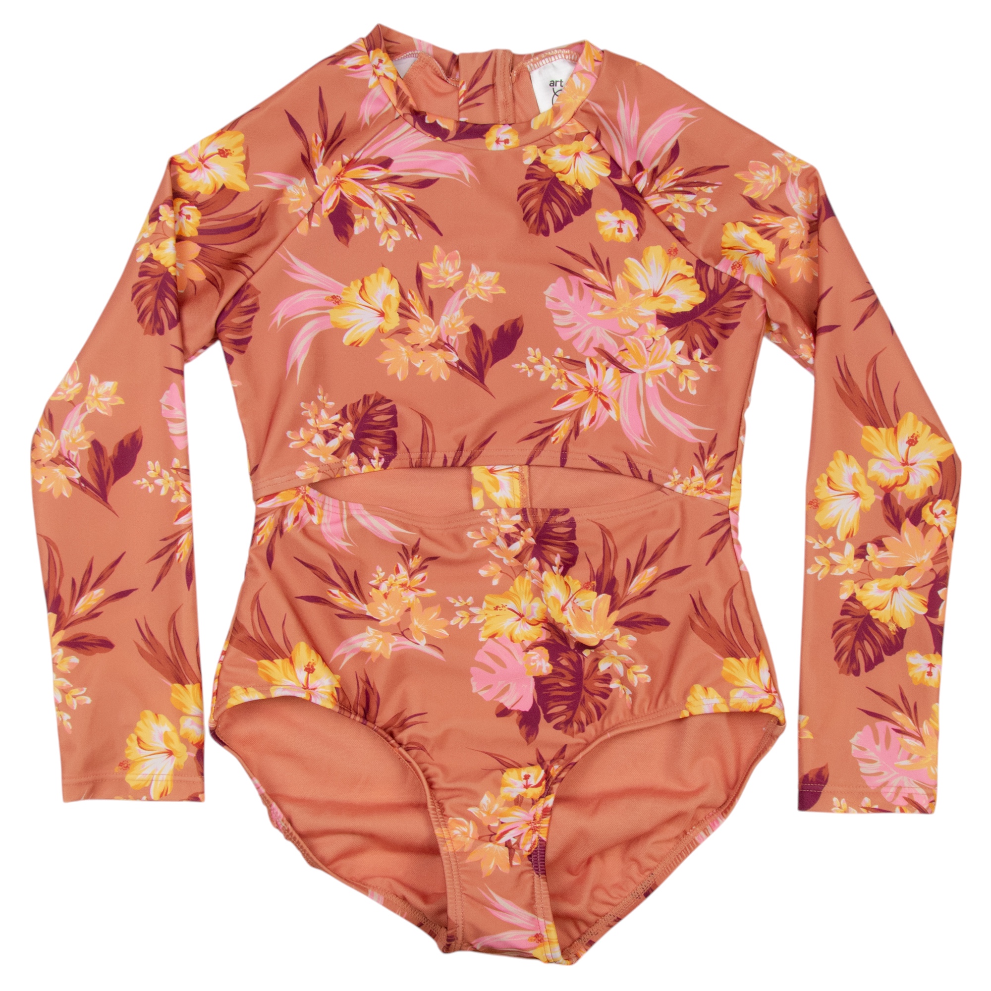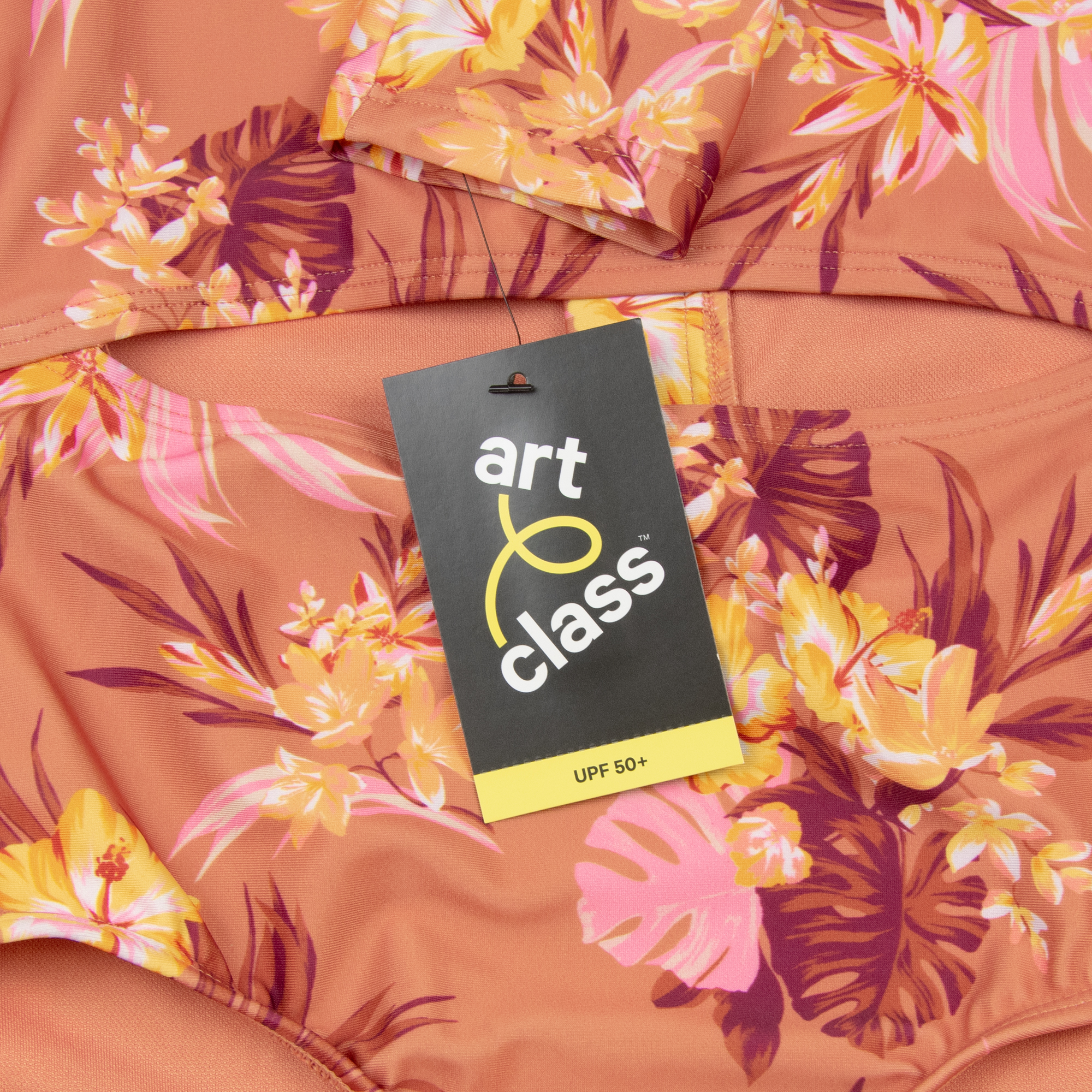 Add a tropical twist to your child's swimwear with this Island Floral-Print One-Piece Rash Guard from art class™. Made from a soft and stretchy fabric for comfy movement in and out of the water, this swimsuit rash guard boasts a UPF 50+ rating that helps keep your kid shielded from the sun's UV rays. The long-sleeve rash guard is adorned with tropical florals on a light brown background and features a cut-out design across the front. Plus, it's designed with a half-length back zipper closure for easy wear. Welcome to art class™, where style is what you make it. Made of 83% recycled polyester and 17% spandex, machine wash cold, tumble dry low. This is a girl's size medium 8 plus. Approximate measurements: 21" torso, 12.5" bust, 19" sleeves, 11" waist, 13" hips.