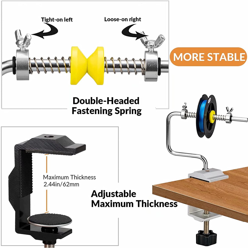 3.ADJUSTABLE MAXIMUM THICKNESS: Maximum thickness of Five Style Line Spooler are all 2.44in/6.2cm. It is adjustable, make fishing more conveniently. C-clamp that can attach to your table, workbench, tailgate, etc. Like a C-clamp, you spin the threaded rod to tighten the clamp onto your table. Fishing Line Winder makes fishing better!
