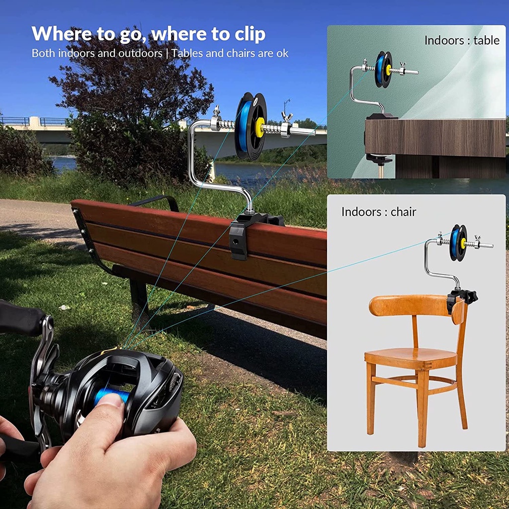 2.MULTIPLE USE LINE SPOOLER: A most have for fisherman. Multiple uses, whether you are at home, boats, truck, or basically anywhere,you can easily take and use this fishing line winder. It is easily portable and can be mounted on anywhere that you can clamp it to. Clamps bottom, no limited by flat or smooth surfaces, and you will get a better hold to spooler by clamping it at the edge of desk, chair and so on.