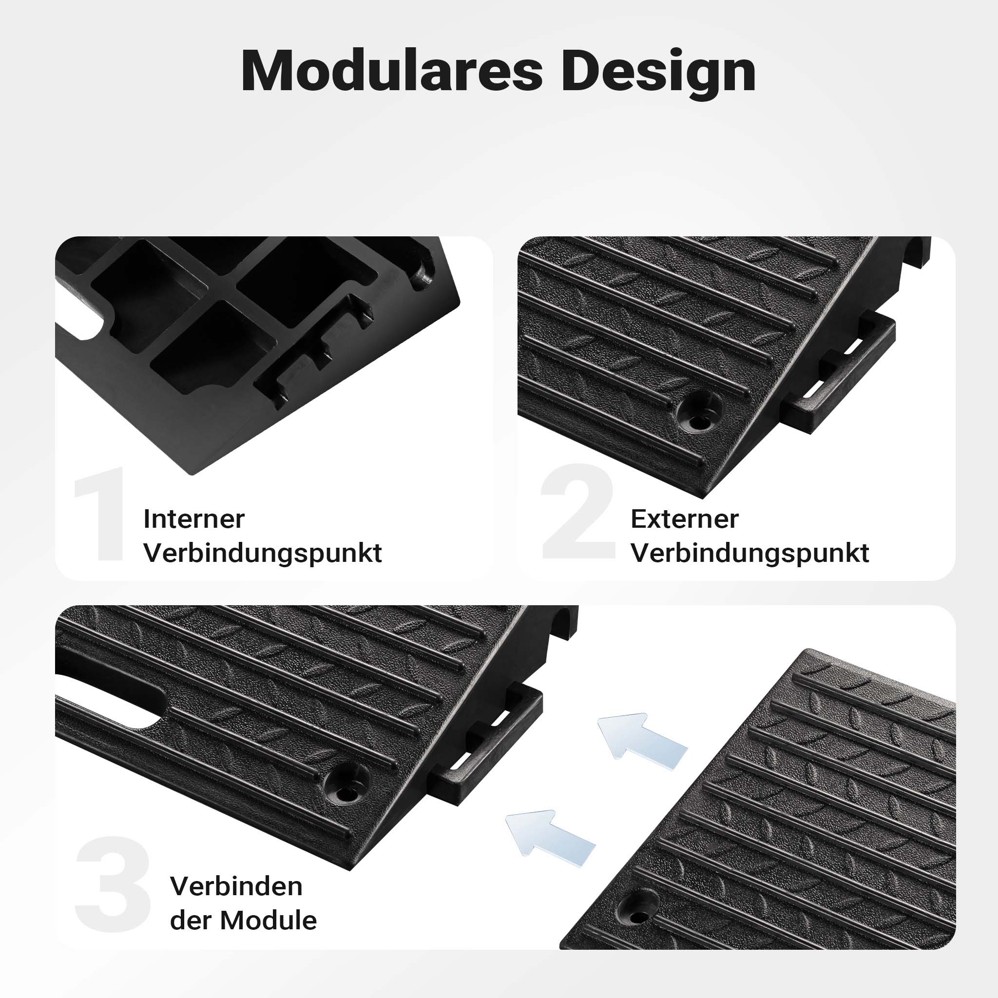 Die Auffahrrampe zeichnet sich durch ihren modularen Aufbau aus. Mehrere Rampen können einfach zusammengesteckt werden, um eine größere Fläche abzudecken. Dies bietet zusätzliche Flexibilität und ermöglicht eine einfache Anpassung an verschiedene Anforderungen und Einsatzorte.