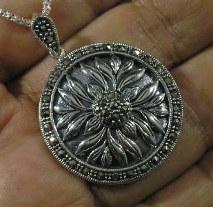 Beautiful round of sterling silver is adorned with a raised flower design and faceted marcasite gems at the center and all around the edge. This dangles from .925 sterling silver teardrop bail embellished with more faceted marcasite. A stunning necklace!