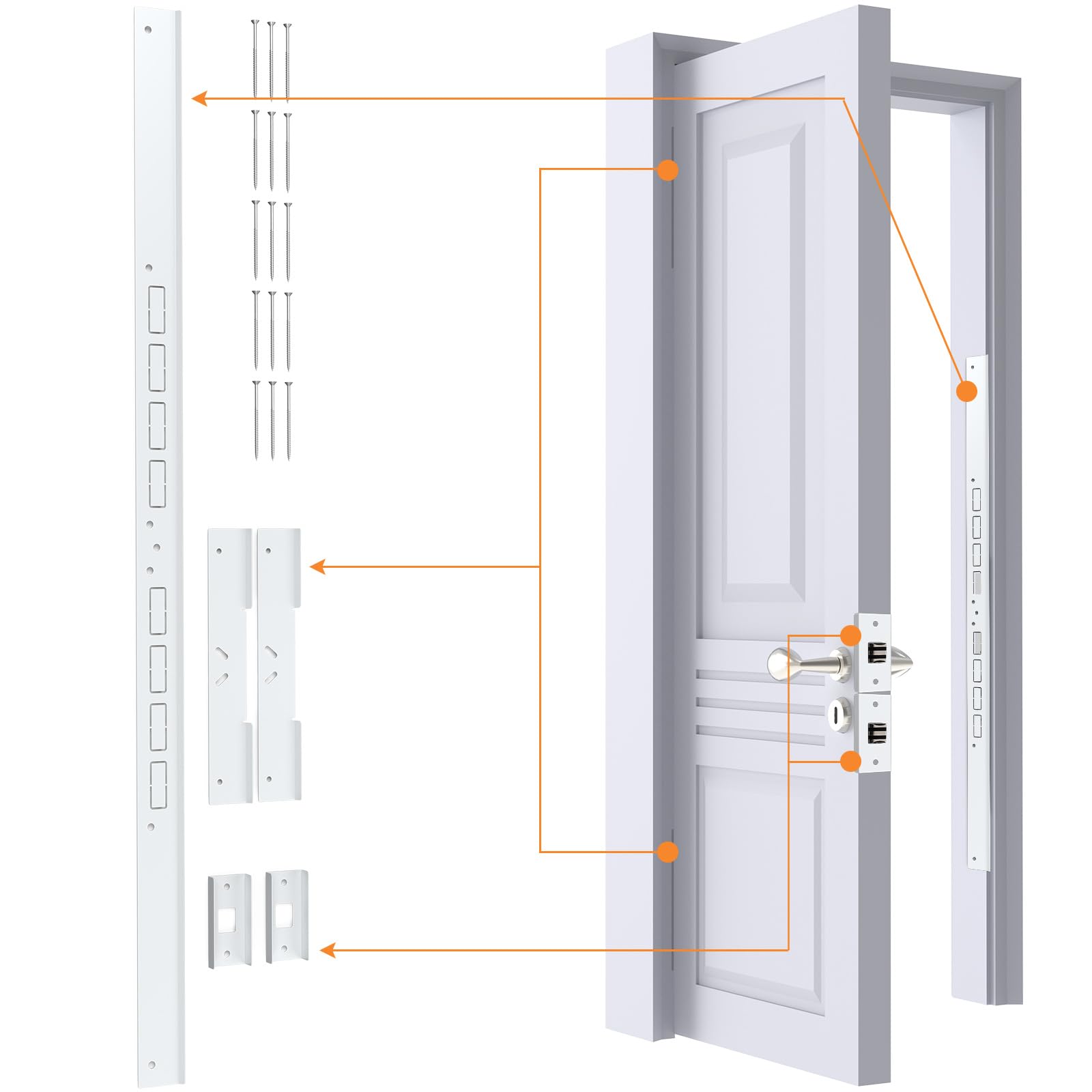 Durable strong contruction: made of stamped steel with a powder coated in white or black, this Door Reinforcement Set for Jamb, Frame & Hinge,Made of 0.08“(2mm) thick steel,and edge passivation treatment to remove sharp cutting burrs.