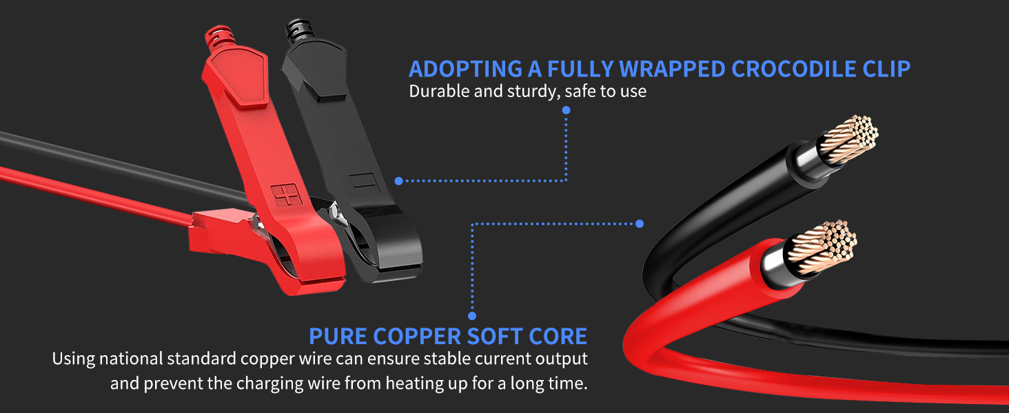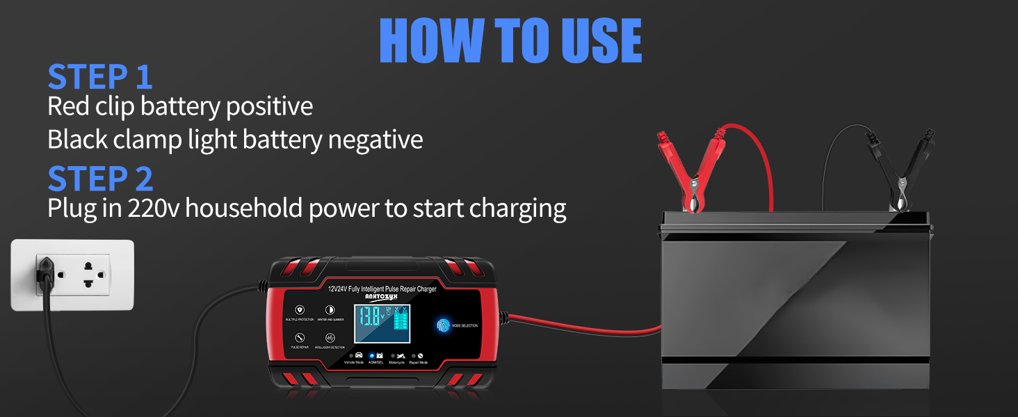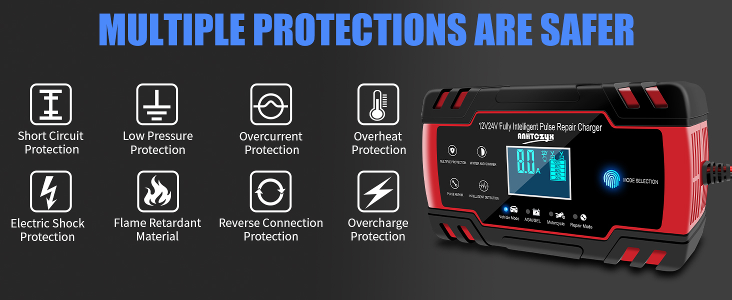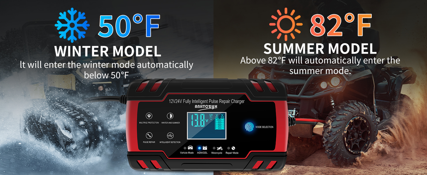 Lightweight and Portable, Easy to Operate:12 volt battery charger weighing only 1.2 lbs, it will automatically stop when it is fully charged, and you do not need to wait during the charging process., easy to carry and store. The car battery charger mode has a memory function. After charging, it defaults to the state mode used before the last power outage. Note: