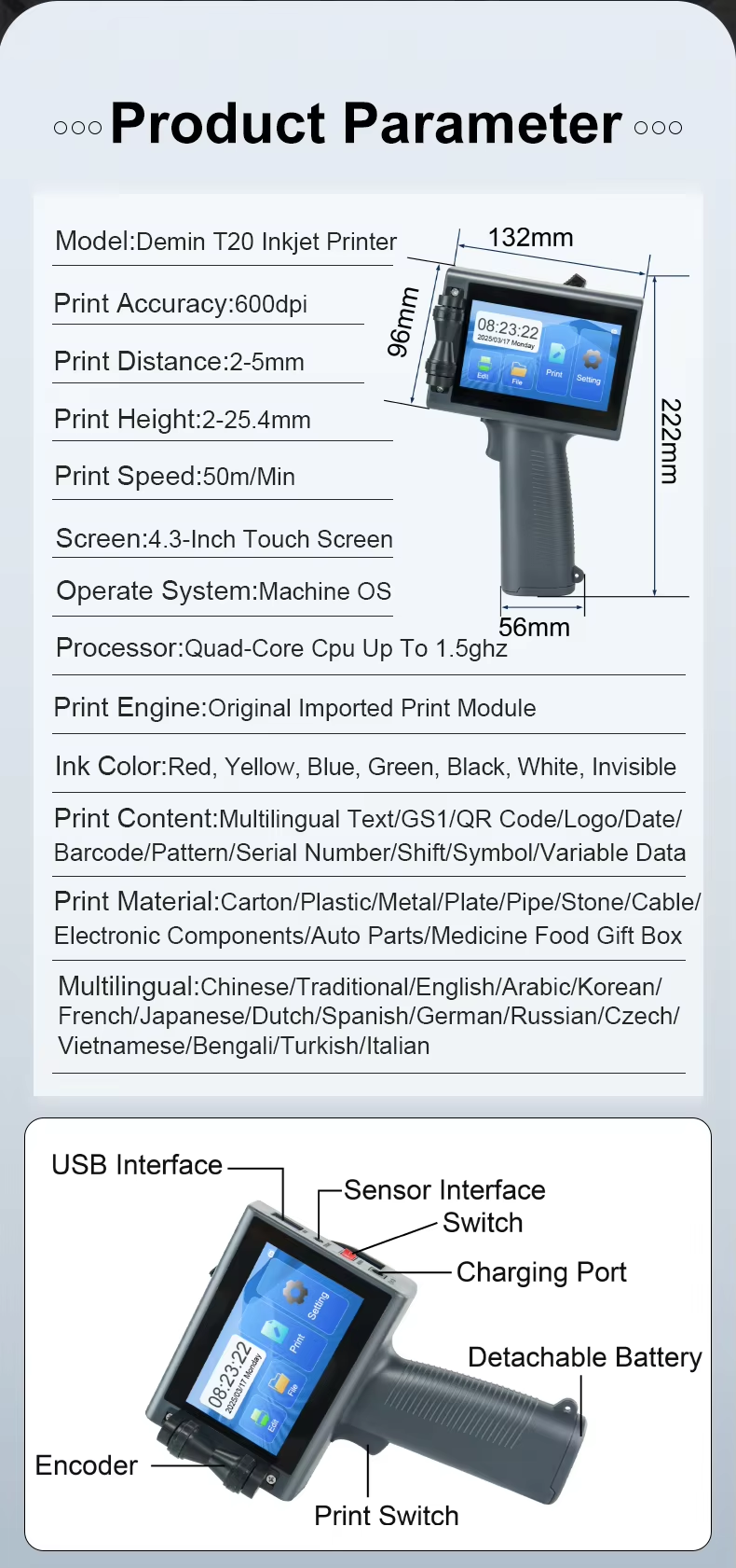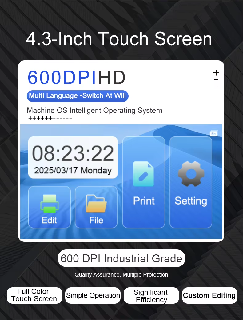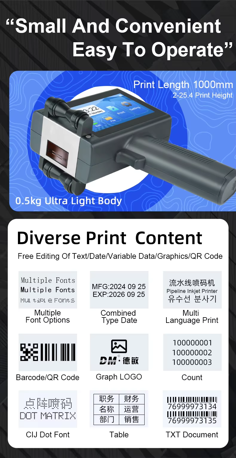 A:The machine can print on paper boxes, plastic, metal, glass, wood, cloth and other materials; Machines are available in height 1.27 cm, 2.54 cm, 5 cm, 10 cm or larger sizes