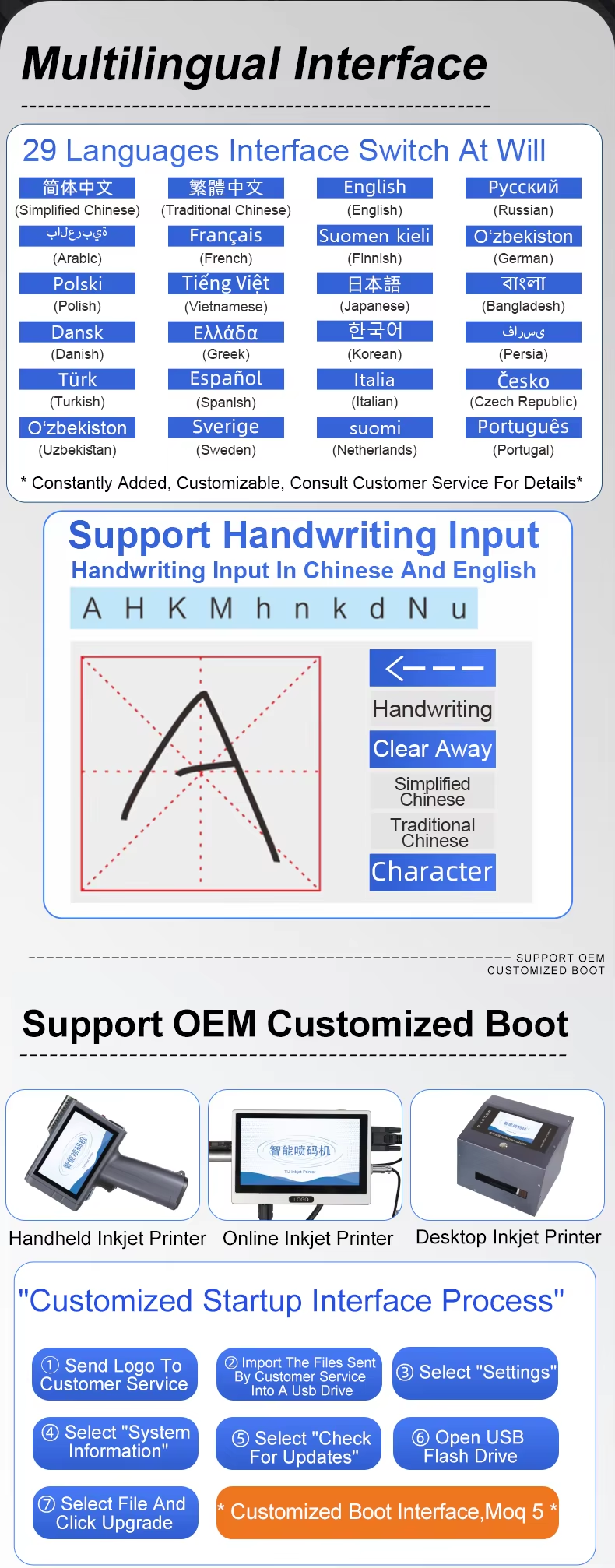 Japanese/Italian/Spanish/Bengali/Dutch/Portuguese/German/Greek and other languages;We can design your brand logo to customize the machine