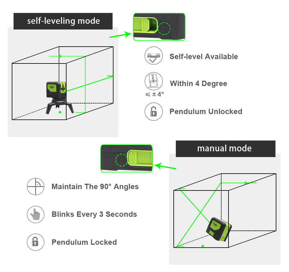 When the pendulum lock is in locked position, you can place the laser tool at various angles to project non-level straight lines. The laser beam will blink every 3-5 seconds to remind you that it's not self-leveling now.