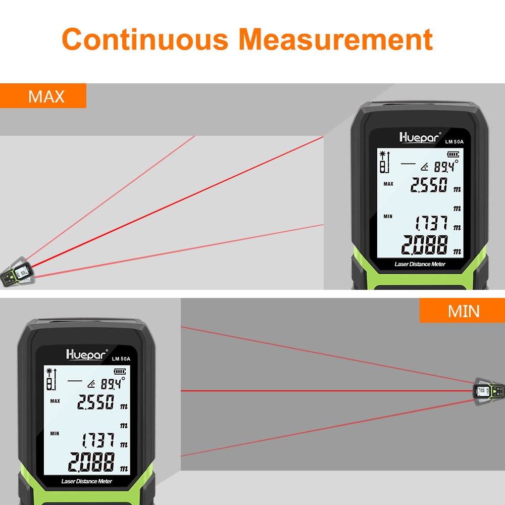 Le télémètre laser numérique Huepar prend en charge divers modes de mesure, notamment la distance, la surface, le volume et la mesure de Pythagore.