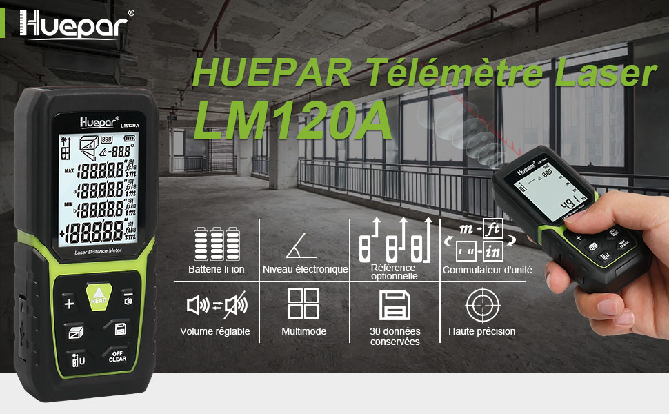 【PRECISION ET COMMUTATION ÉLEVÉE】: La mesure de distance Huepar se caractérise par une mesure à longue portée avec une précision extrême et peut mesurer des distances allant jusqu'à 120m en 2 mm. L'outil peut mesurer à partir de points de référence avant / milieu / arrière, ce qui facilite la mesure dans différents scénarios. Toutes les mesures sont affichées en temps réel et peuvent être commutées librement entre M / In / Ft.