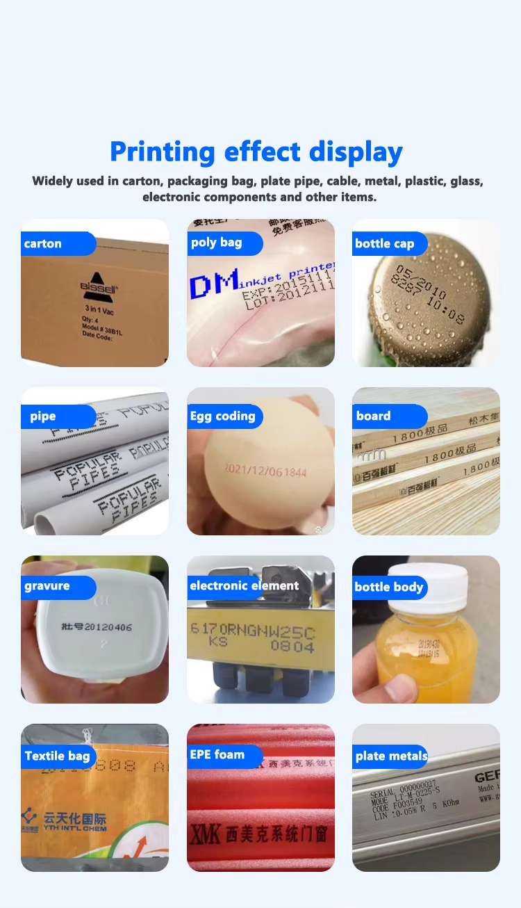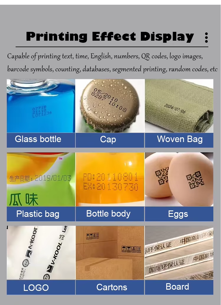 A:You can print date, text, logo, variable data, batch number, QR code, serial number and other content. Red, yellow, blue, green, black, white and other colors are available.