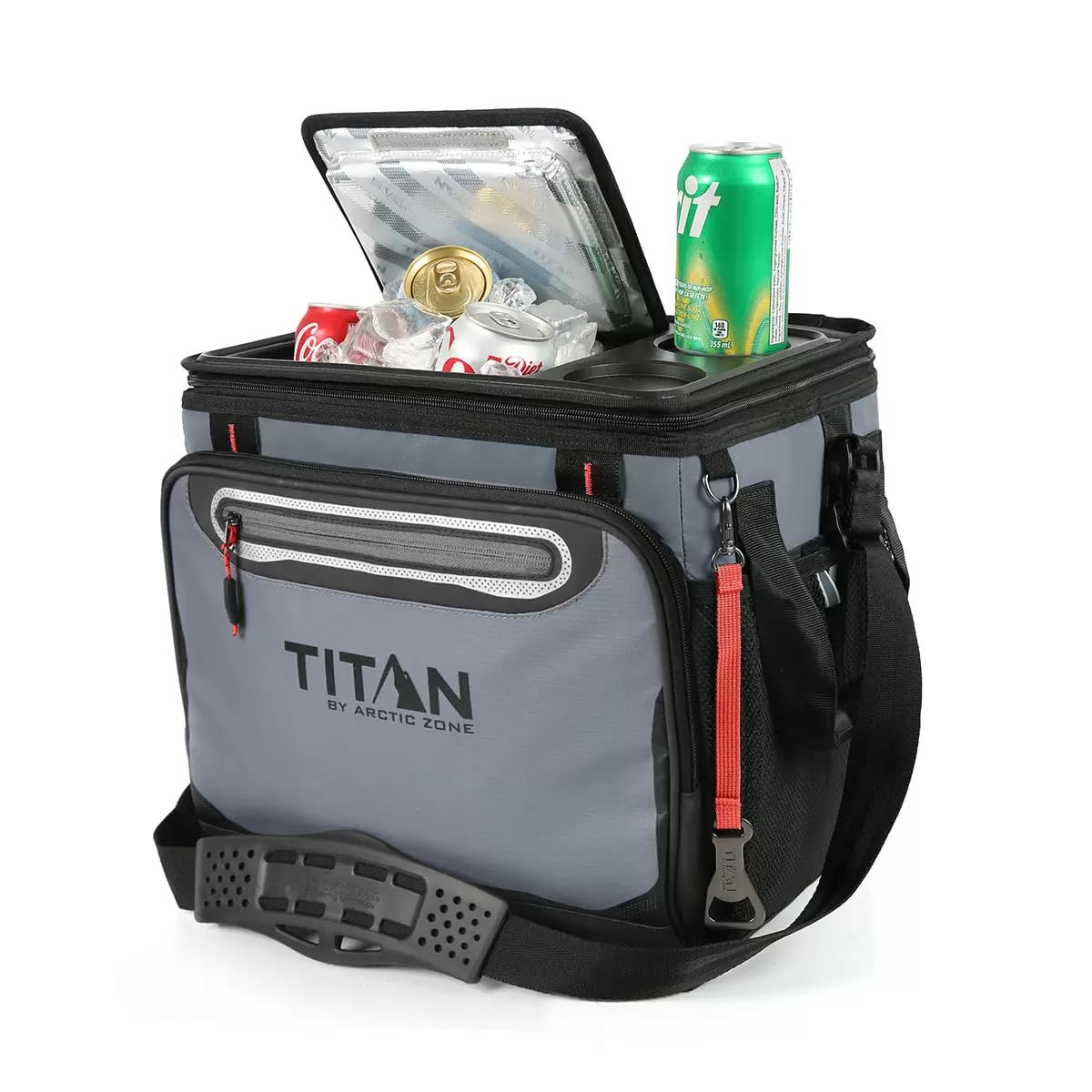 The Titan by Arctic Zone 40-Can Collapsible Cooler offers ample storage and keeps ice frozen for up to 2 days! Designed for convenience, it features a durable TableTop with an easy-access lid, two built-in drink holders, and a detachable bottle opener for added practicality. Inside, the cooler is equipped with SuperFoam insulation and a Therma-Flect radiant barrier, ensuring contents stay cold and fresh. The Ultra Safe leak-proof lining* is easy to clean, while the water- and stain-resistant exterior makes maintenance effortless. For extra storage, it includes an insulated front compartment, a zippered pocket, and sturdy carry handles. The adjustable Backsaver shoulder strap with an anti-slip pad evenly distributes weight, making it comfortable to carry. With its large capacity, this cooler is perfect for picnics, camping, tailgating, beach trips, or any adventure where you need to keep food and drinks chilled. When not in use, simply collapse it for easy storage!