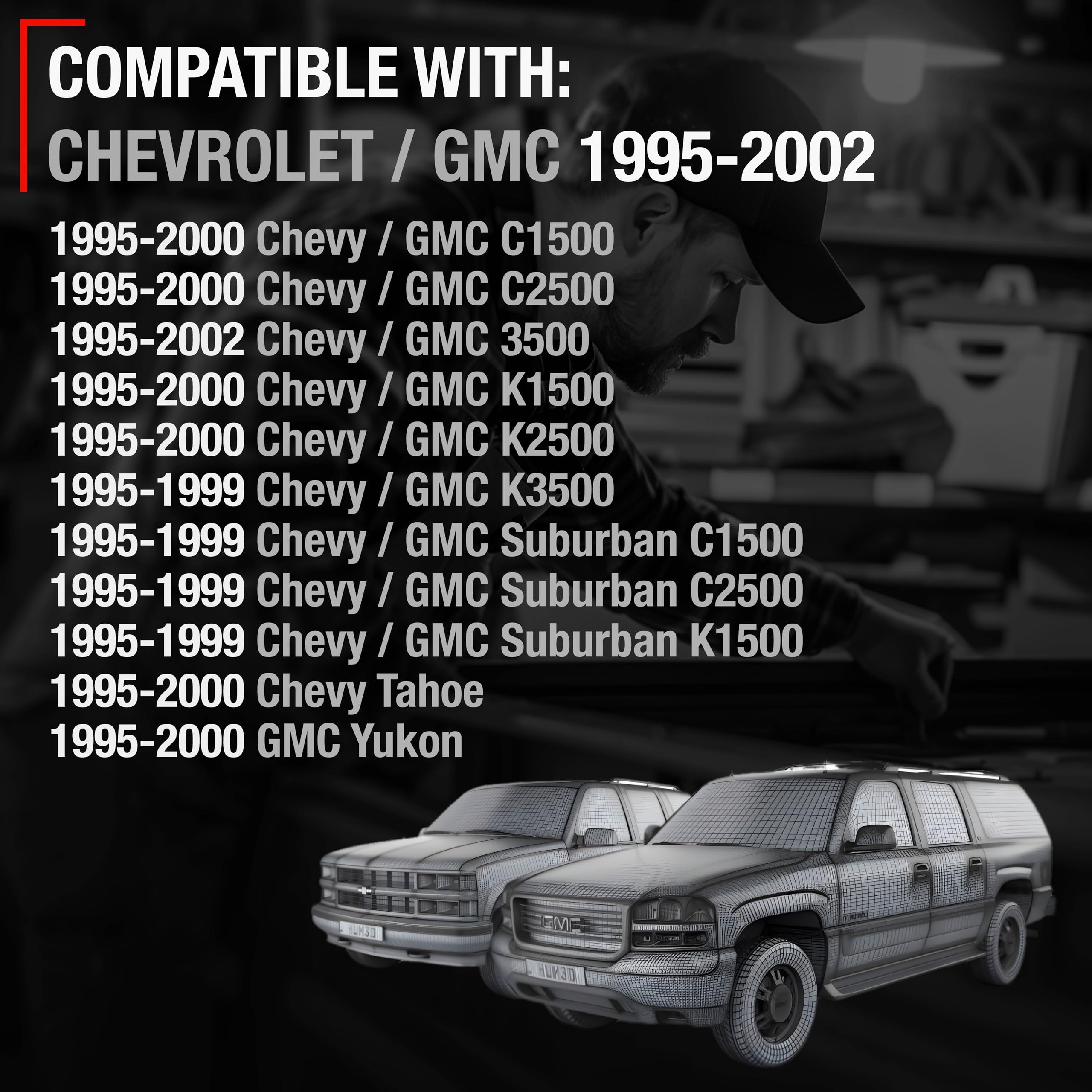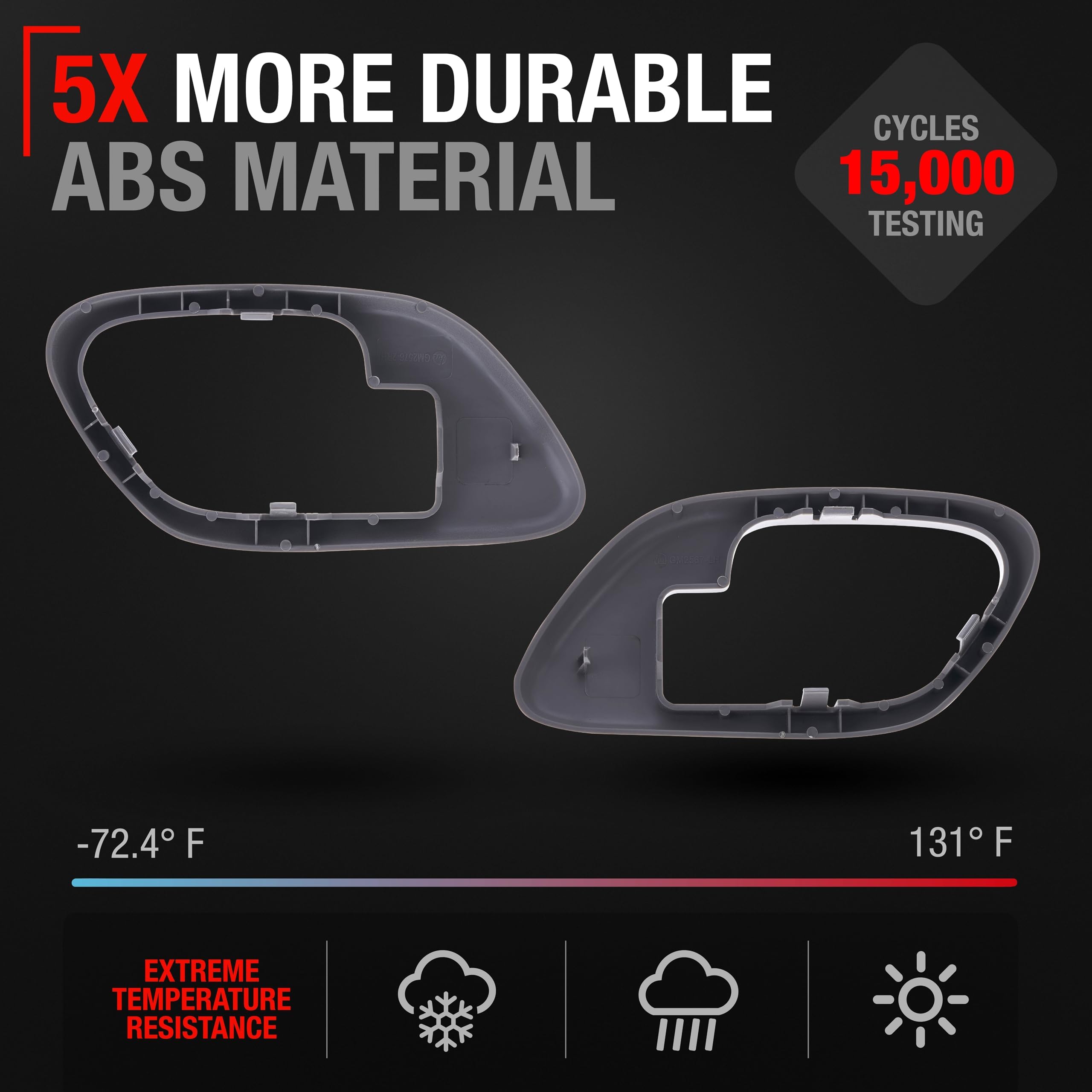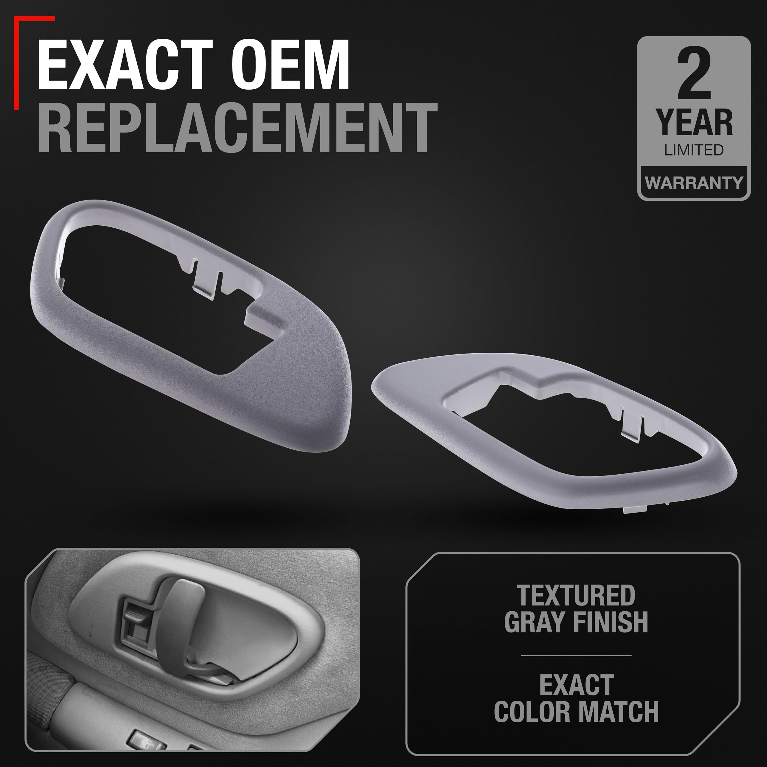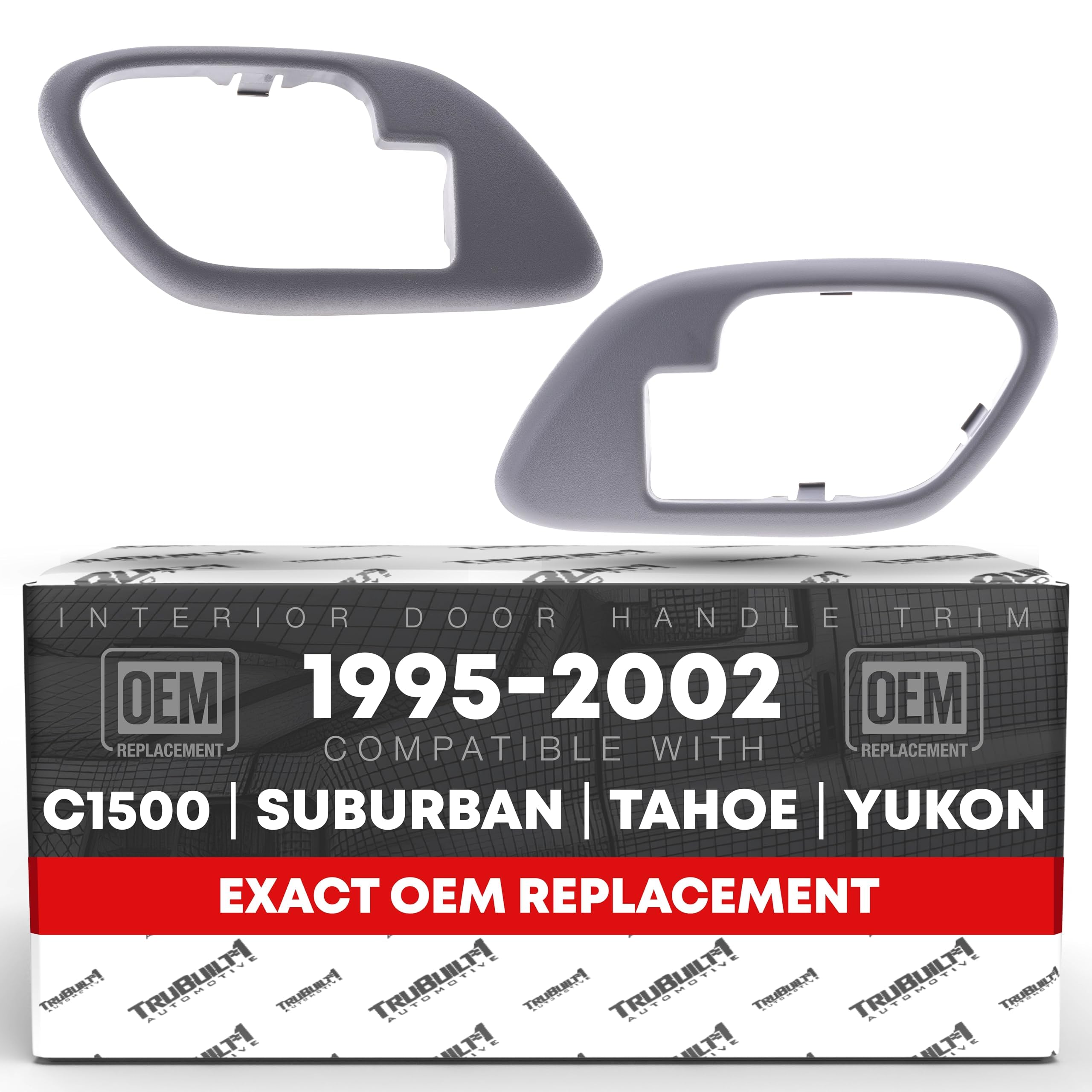 Upgrade the interior functionality and style of your vehicle with our high-quality Interior Door Handle Set Bezel Replacement. Compatible with 1995-2000 Chevrolet C/K 1500, 2500, 3500, Suburban, Tahoe; GMC C/K 1500, 2500, 3500, Suburban, Yukon, these replacement parts directly matches OEM specifications with part numbers 15708079, 15708080, GM1358100, GM1359100, ensuring flawless performance for Chevrolet and installment. Models: 1995-99 Chevy C1500 1995-00 Chevy C2500 1995-02 Chevy C3500 1995-99 Chevy K1500 1995-00 Chevy K2500 1995-00 Chevy K3500 1995-99 Chevy Suburban C1500 1995-99 Chevy Suburban C2500 1995-99 Chevy Suburban K1500 1995-99 Chevy Suburban K2500 1995-2000 Chevy Tahoe 1995-00 GMC C1500 1995-00 GMC C2500 1995-02 GMC C3500 1995-00 GMC K1500 1995-00 GMC K2500 1995-99 GMC Suburban C1500 1995-99 GMC Suburban C2500 1995-99 GMC Suburban K1500 1995-99 GMC Suburban K2500 1995-2000 GMC Yukon Our door handle set is crafted from durable plastic, featuring a stylish textured gray finish that complements your vehicle’s interior. Designed specifically for the front right and left doors, this set offers comprehensive coverage and functionality. The installation process is simple and can be easily accomplished at home with just a few basic tools. Opt for our Interior Door Handle Set to maintain the operational efficiency and enhance the comfort and style of your vehicle's interior.