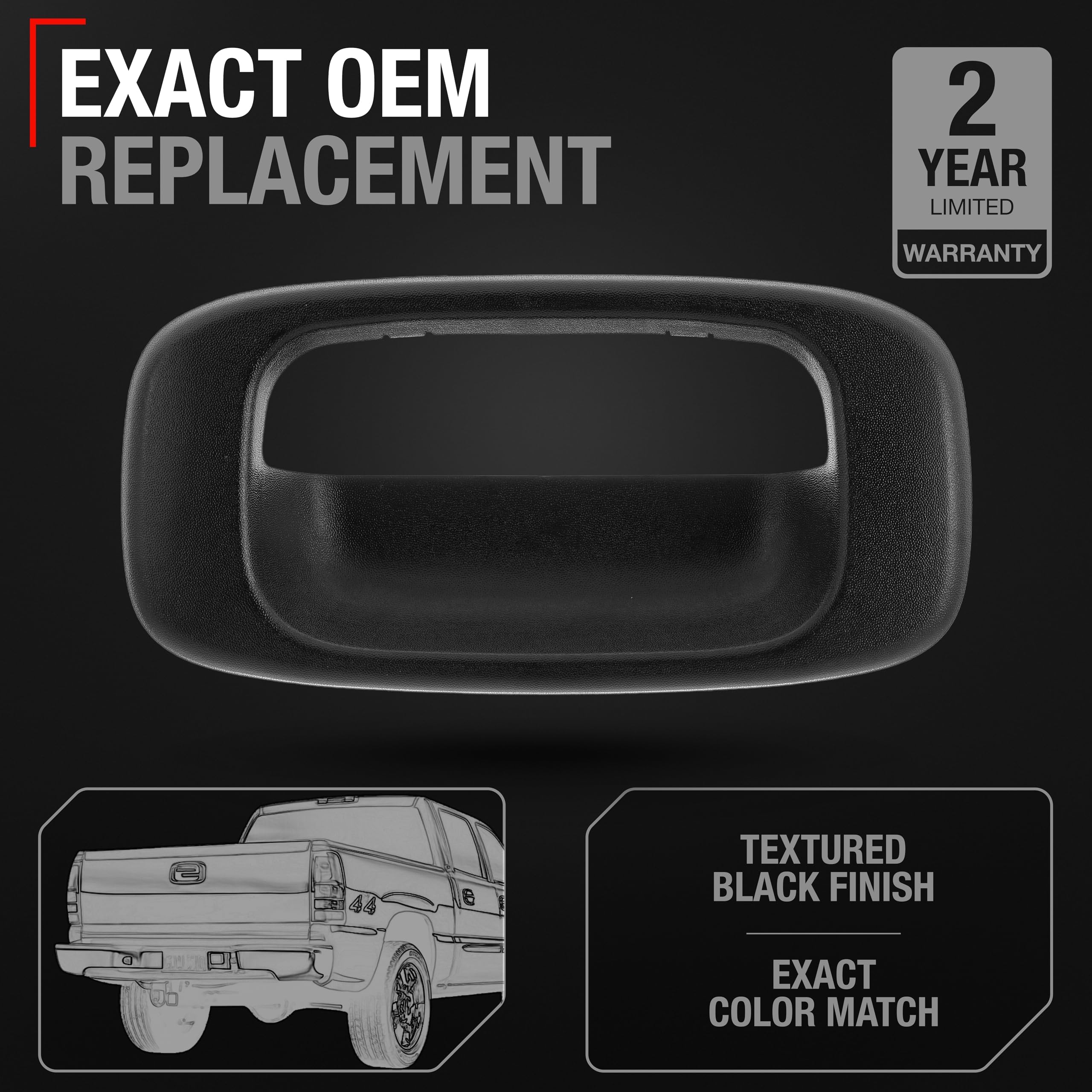 Upgrade the functionality and aesthetics of your vehicle's tailgate with our Tailgate Bezel, compatible with 1999-2006 Chevrolet Silverado 1500, 2001-2007 Chevrolet Silverado 1500 (HD, Classic and HD Classic), 1999-2004 Chevy Silverado 2500, 2001-2007 Chevy Silverado 2500 (HD, Classic, HD Classic), 2001-2006 Chevy Silverado 3500, 2007 Chevy Silverado 3500 Classic, 1999-2006 GMC Sierra 1500, 2001-2007 GMC Sierra 1500 (HD, Classic and HD Classic), 1999-2004 GMC Sierra 2500, 2001-2007 GMC Sierra 2500 (HD, Classic, HD Classic), 2001-2006 GMC Sierra 3500, 2007 GMC Sierra 3500 Classic. This high-quality replacement part is designed to meet or exceed OEM specifications with part numbers including 15228539, 76106, GM1916102 , ensuring a perfect fit and easy installation. This handle features a robust plastic construction with a textured finish that complements your vehicle's exterior. It is specifically designed to replace worn or broken tailgate handles bezel trim, restoring the integrity and functionality of your vehicle’s rear access. Crafted from durable plastic with a textured finish, this tailgate handle ensures longevity and reliable performance, maintaining smooth operation and enhancing the security of your vehicle’s tailgate. The installation process is straightforward, allowing for quick and efficient replacement without the need for professional help.