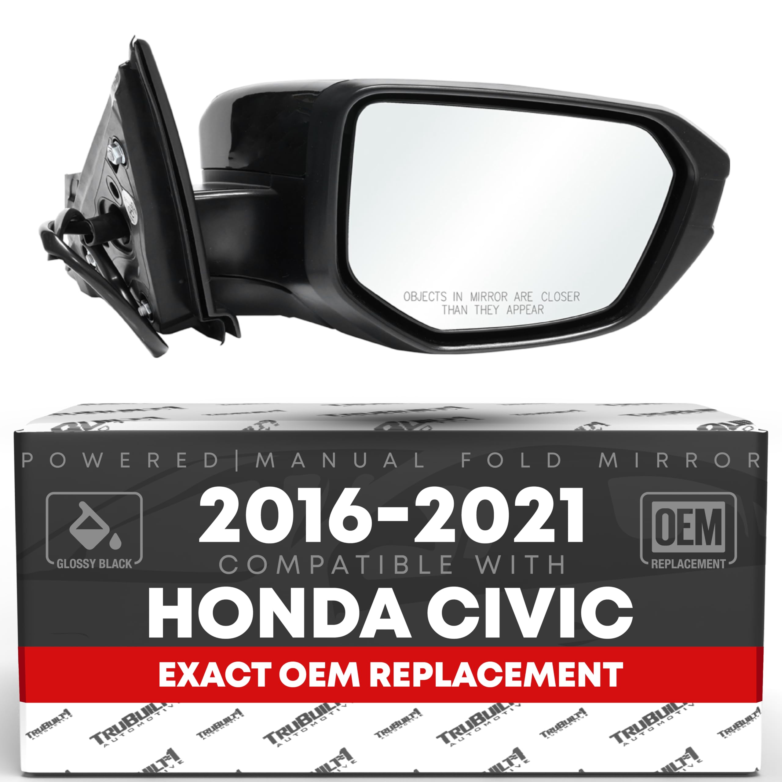 Upgrade the functionality and aesthetics of your vehicle's side view with our Power Door Mirror, compatible with 2016-2021 Honda Civic. This high-quality replacement part is designed to meet or exceed OEM specifications with part numbers 76208TBAA02ZA, 76201TBAA11ZF, HO1321283, ensuring a perfect fit and easy installation. This front right-hand side mirror features a power adjustment mechanism, heated mirror with blind spot detector and turn signal, manual folding design, and convex glass with English warning to enhance your driving safety by providing a broader view. The mirror's smooth black cover, made from robust 4H3P plastic material, not only provides durability but also complements your vehicle’s exterior styling. Crafted from durable materials, this power door mirror ensures longevity and reliable performance, maintaining the functionality and aesthetics of your vehicle’s exterior. The installation process is straightforward, allowing for quick and efficient replacement without the need for professional help.
