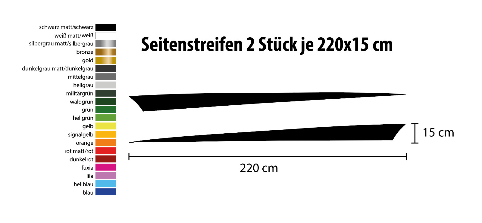 Bring frischen Wind in deinen Look mit unseren hochwertigen Seitenstreifen Aufklebern! Wähle aus einer Vielzahl an Farben und Designs – darunter unser sportliches, abstraktes Zacken-Dekor. Diese Aufkleber sind flexibel positionierbar und lassen sich auch in kürzeren Varianten anbringen.
