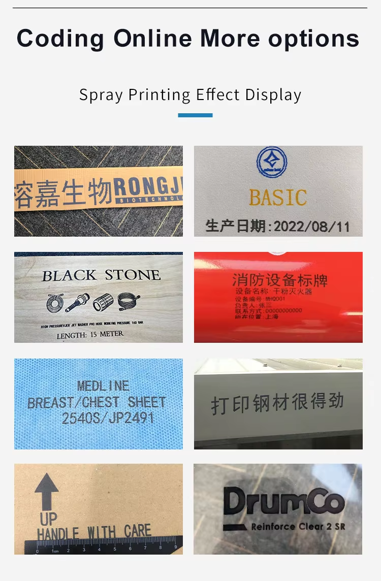 A:You can print date, text, logo, variable data, batch number, QR code, serial number and other content. Red, yellow, blue, green, black, white and other colors are available.