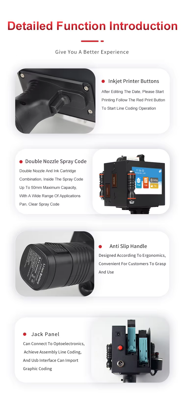 Our main business is: TIJ inkjet printers, CIJ inkjet printers, UV inkjet printers, laser inkjet printers, conveying equipment, accessories and consumables and other products, products are widely used in printing, electronics, plastics, hardware, food and beverage, medicine, cosmetics, tobacco, wood, auto parts, cables and building materials and other fields. At present, we have cooperated with more than 100 countries and regions, including Italy, Spain, the United States, Canada, Mexico, Russia, Vietnam, Thailand and so on. We always adhere to the customer first, continuous innovation and upgrading, and strive to provide all customers with the best products and services, committed to becoming the most reliable supplier!