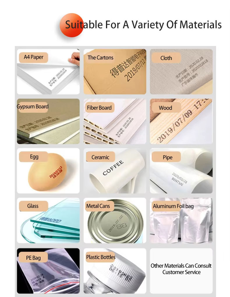 A:The machine can print on paper boxes, plastic, metal, glass, wood, cloth and other materials; Machines are available in height 1.27 cm, 2.54 cm, 5 cm, 10 cm or larger sizes