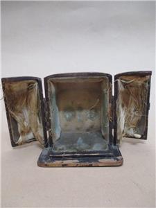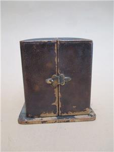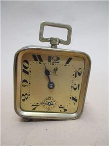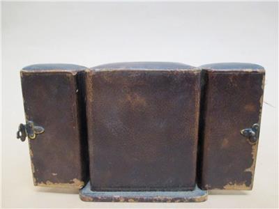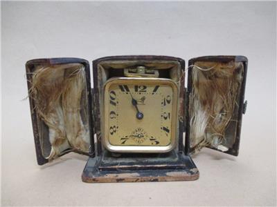 Fair overall condition. Leather carry case is very worn on outside, but still has its clasp, functional hinges and closes properly. However the silk lining to inside is shredded and has been corroded by the metal of the clock mechanisms over time. The clock itself DOES RUN, it ticks quite consistently, sometimes a little erratically. It is however, missing a hand to face and a foot to bottom. Also has no glass to face. Tin body around face is heavily dented, and has shifted out of place in top left corner. Clock body has light surface pitting and light spots of corrosion to back. Missing maybe one lever to back, please view photos provided. Priced as is.