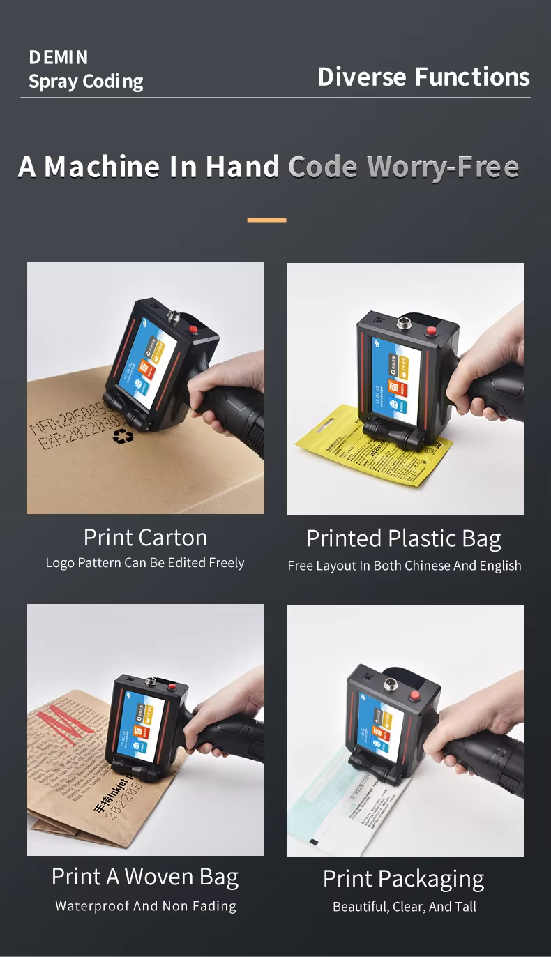 A:You can print date, text, logo, variable data, batch number, QR code, serial number and other content. Red, yellow, blue, green, black, white and other colors are available.