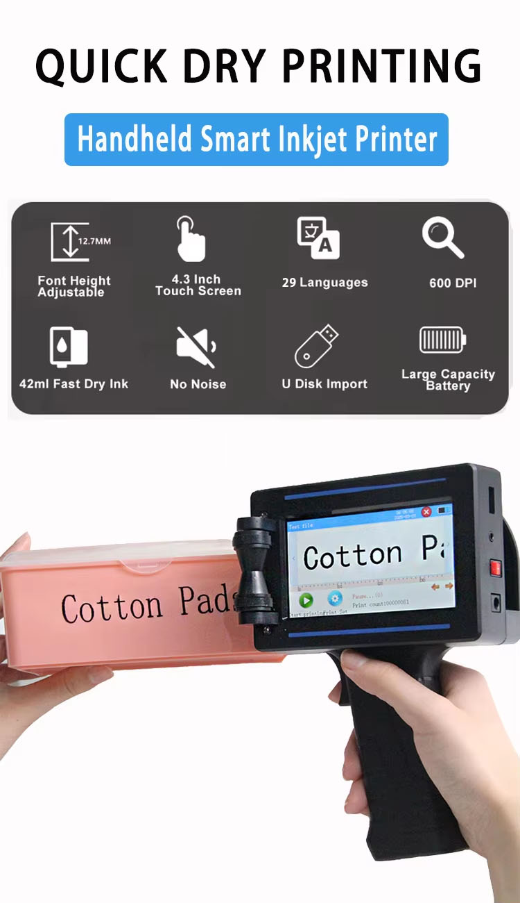 A:The machine can print on paper boxes, plastic, metal, glass, wood, cloth and other materials; Machines are available in height 1.27 cm, 2.54 cm, 5 cm, 10 cm or larger sizes