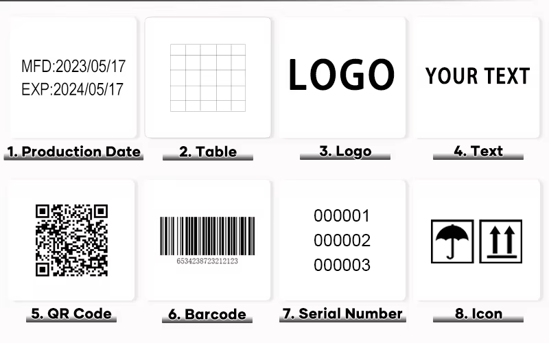 A:You can print date, text, logo, variable data, batch number, QR code, serial number and other content. Red, yellow, blue, green, black, white and other colors are available.