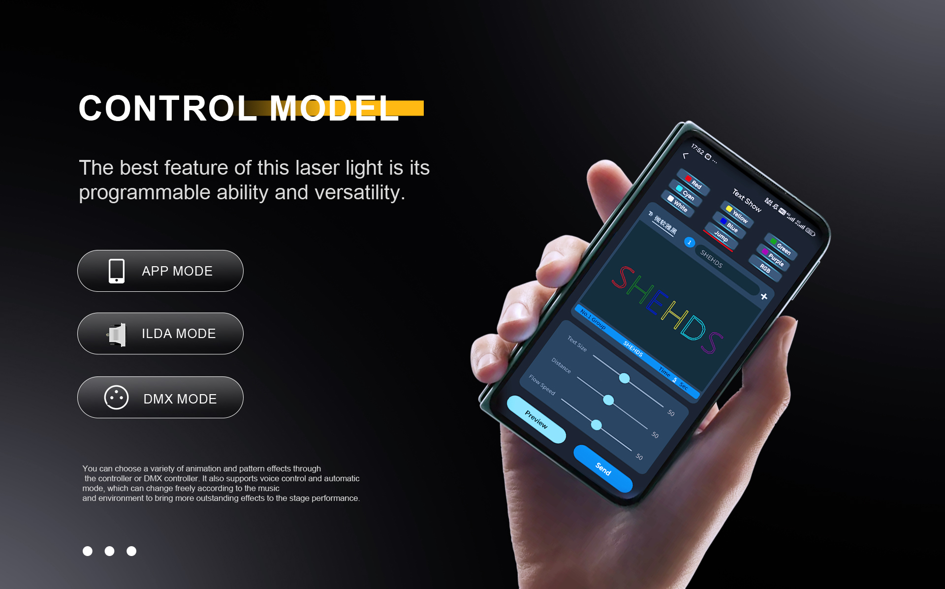 You can choose a variety of animation and pattern effects through the controller or DMX controller.