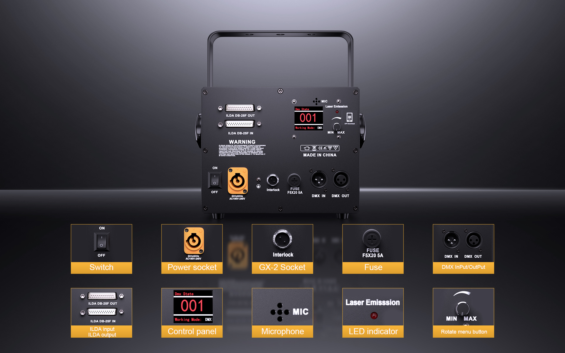 | Control interface | DMX In/Out ,ILDA In/Out |