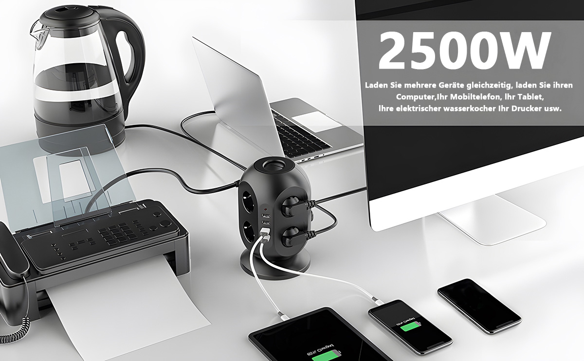 Mehrfachsteckdose Tower Steckdosenleiste Mit 8 Fach 4 USB-Anschluss Steckdose 2500W