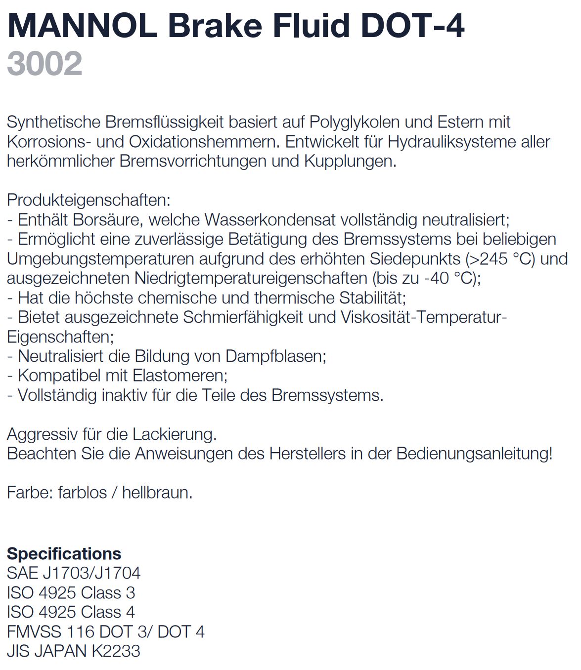 Hersteller: MANNOLArtikelnummer: MN3002-1_2Synthetische Bremsflüssigkeit basiert auf Polyglykolen und Estern mit Korrosions- und Oxidationshemmern. Entwickelt für Hydrauliksysteme aller herkömmlicher Bremsvorrichtungen und Kupplungen.