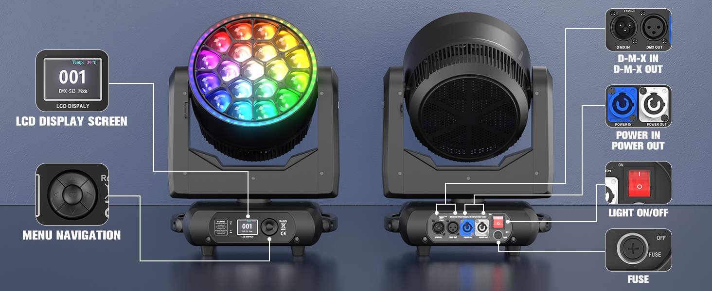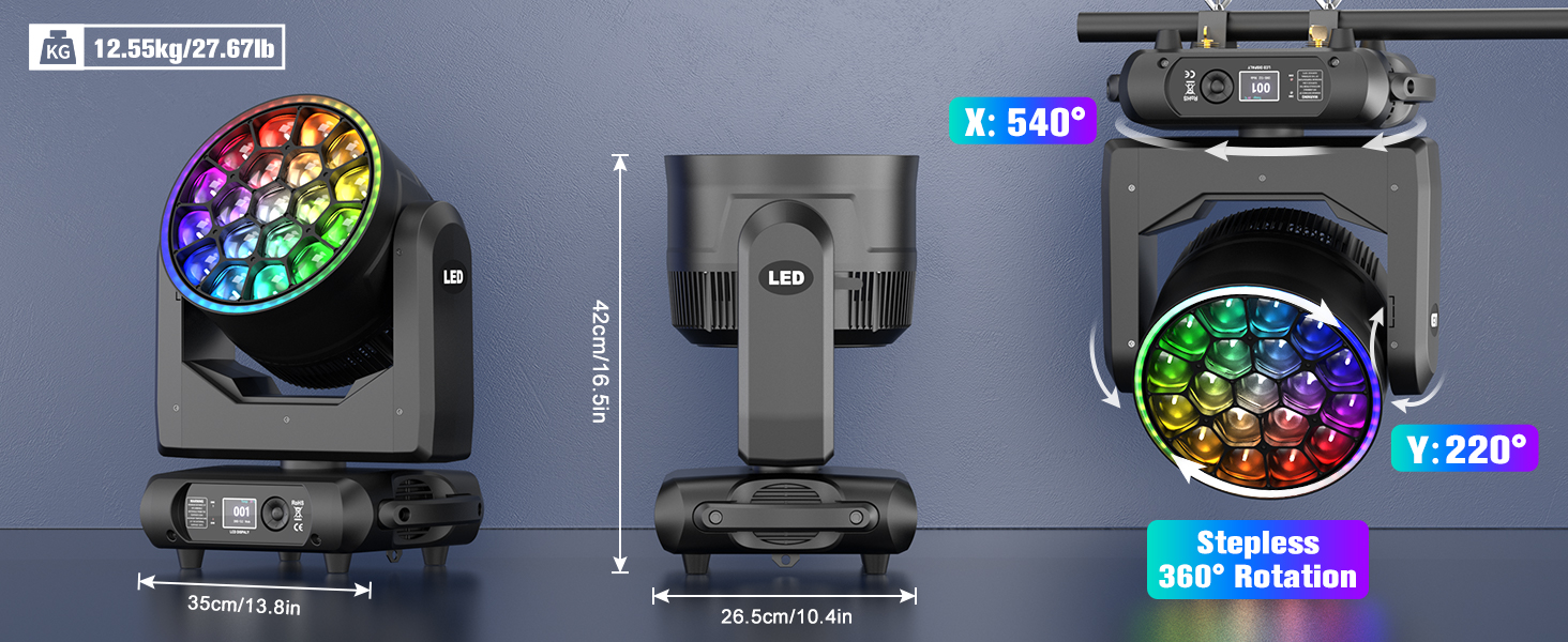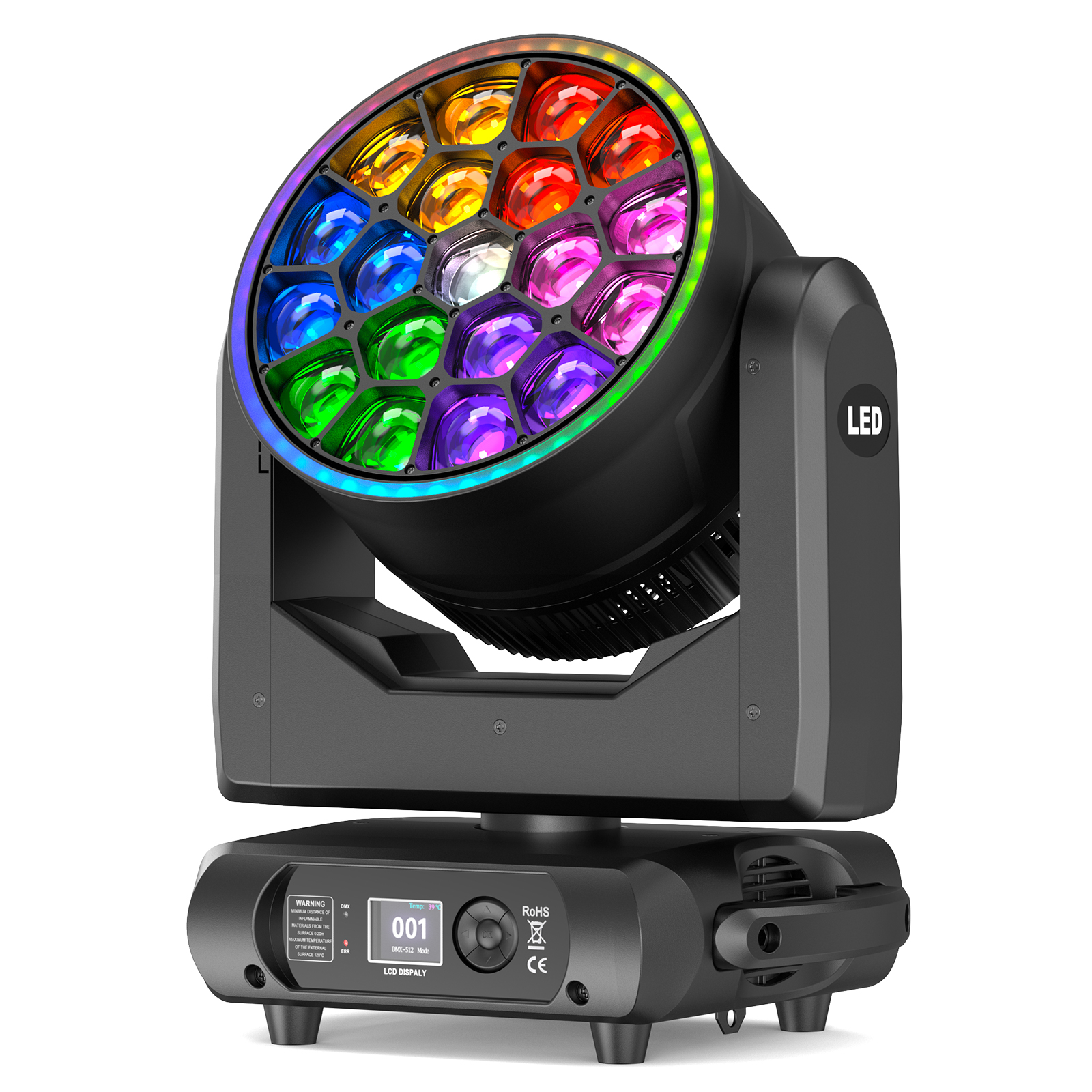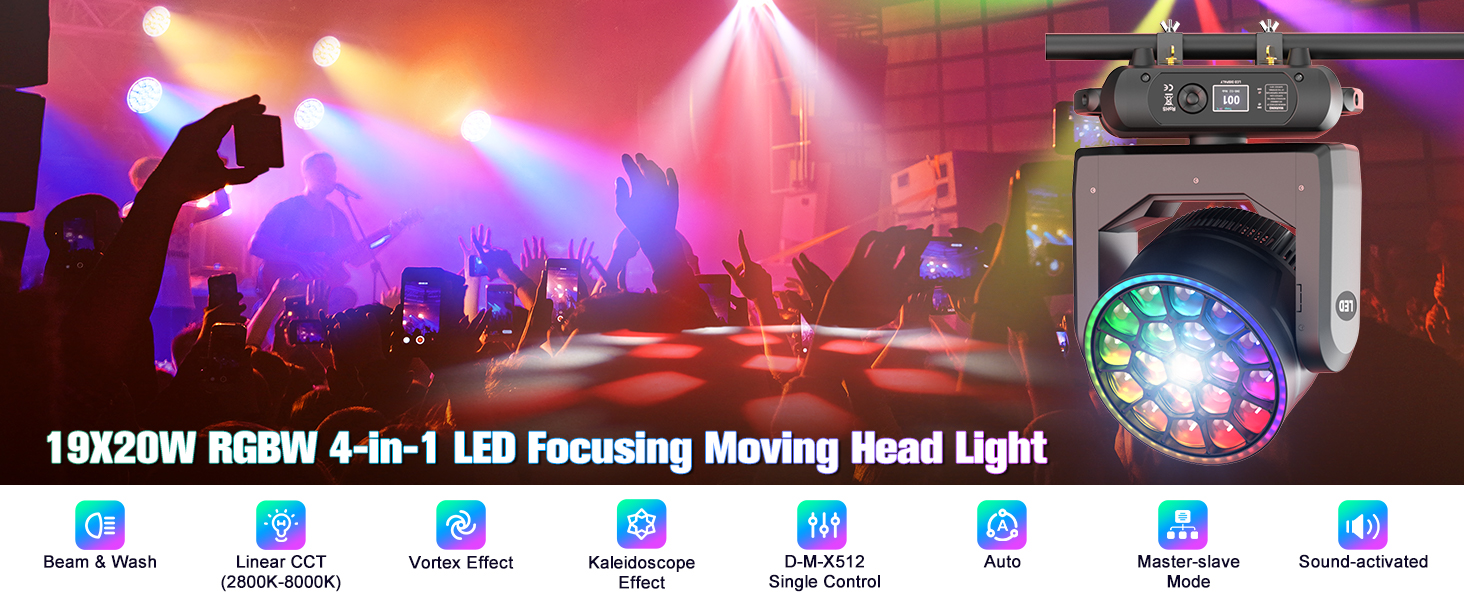 1.Equipped with 19 high-power 20W RGBW LEDs (16.7 million colors) and 47 full-color auxiliary LEDs, this light delivers vibrant, uniform lighting with zero color spots. Built-in dynamic effects create stunning visual impact for any venue.